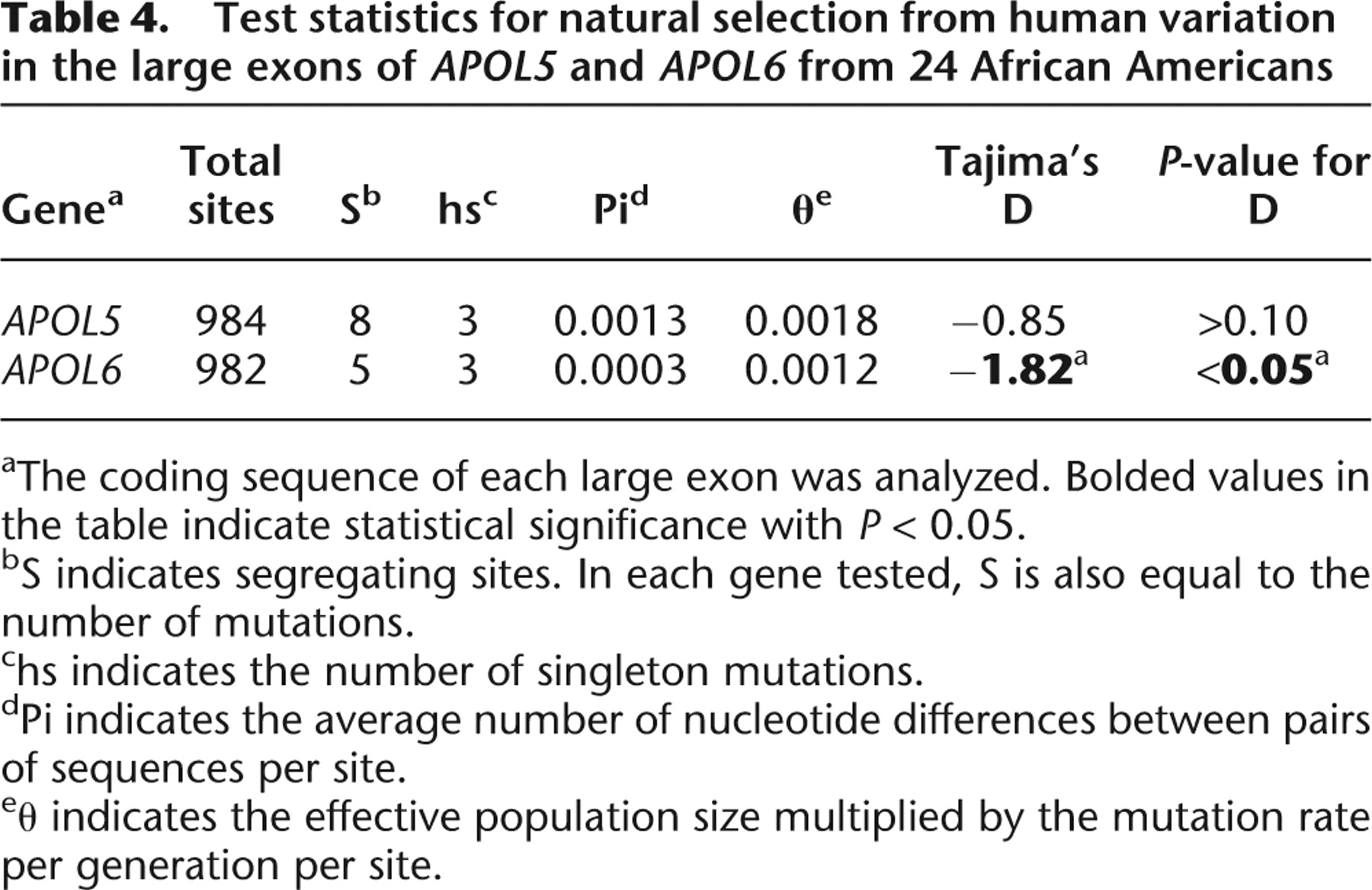 Test statistics for natural selection from human variation in the large exons of APOL5 and APOL6 from 24 African Americans