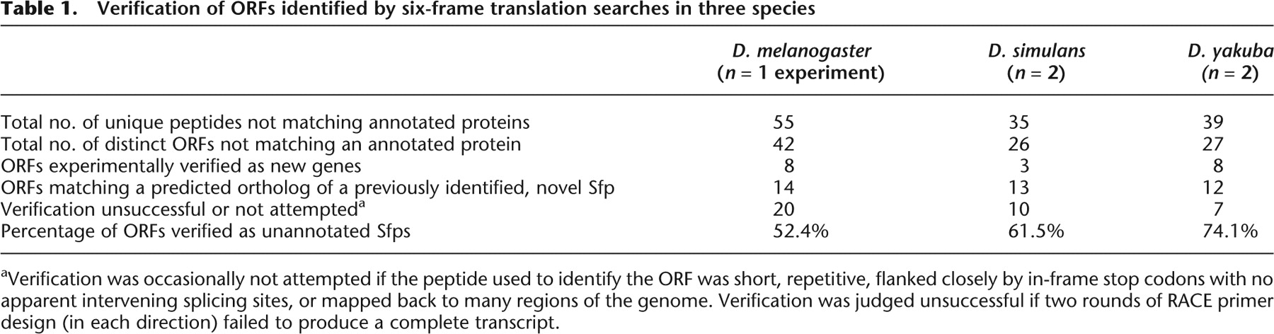 aVerification was occasionally not attempted if the peptide used to identify the ORF was short, repetitive, flanked closely by in-frame stop codons with no apparent intervening splicing sites, or mapped back to many regions of the genome. Verification was judged unsuccessful if two rounds of RACE primer design (in each direction) failed to produce a complete transcript.