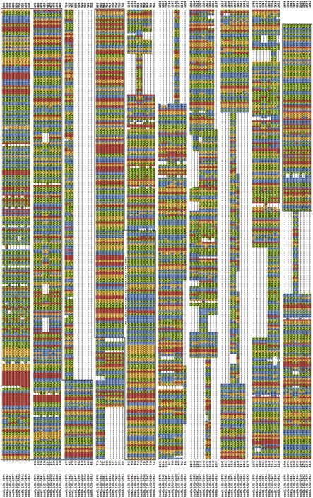 Alignment of the nucleotide sequences of the noncoding regions from plasmid clones with the cox1 (three clones), nad4 (two clones), and nad5 (four clones) minicircular mitochondrial chromosomes. Dashes indicate gaps. The three highly conserved blocks of sequences at the start, middle, and end of the noncoding region are boxed. The sequence that can form a stem-loop is marked with asterisks (see also Fig. 5). The coding region (data not shown) of each clone is located between the end and start of these noncoding regions.