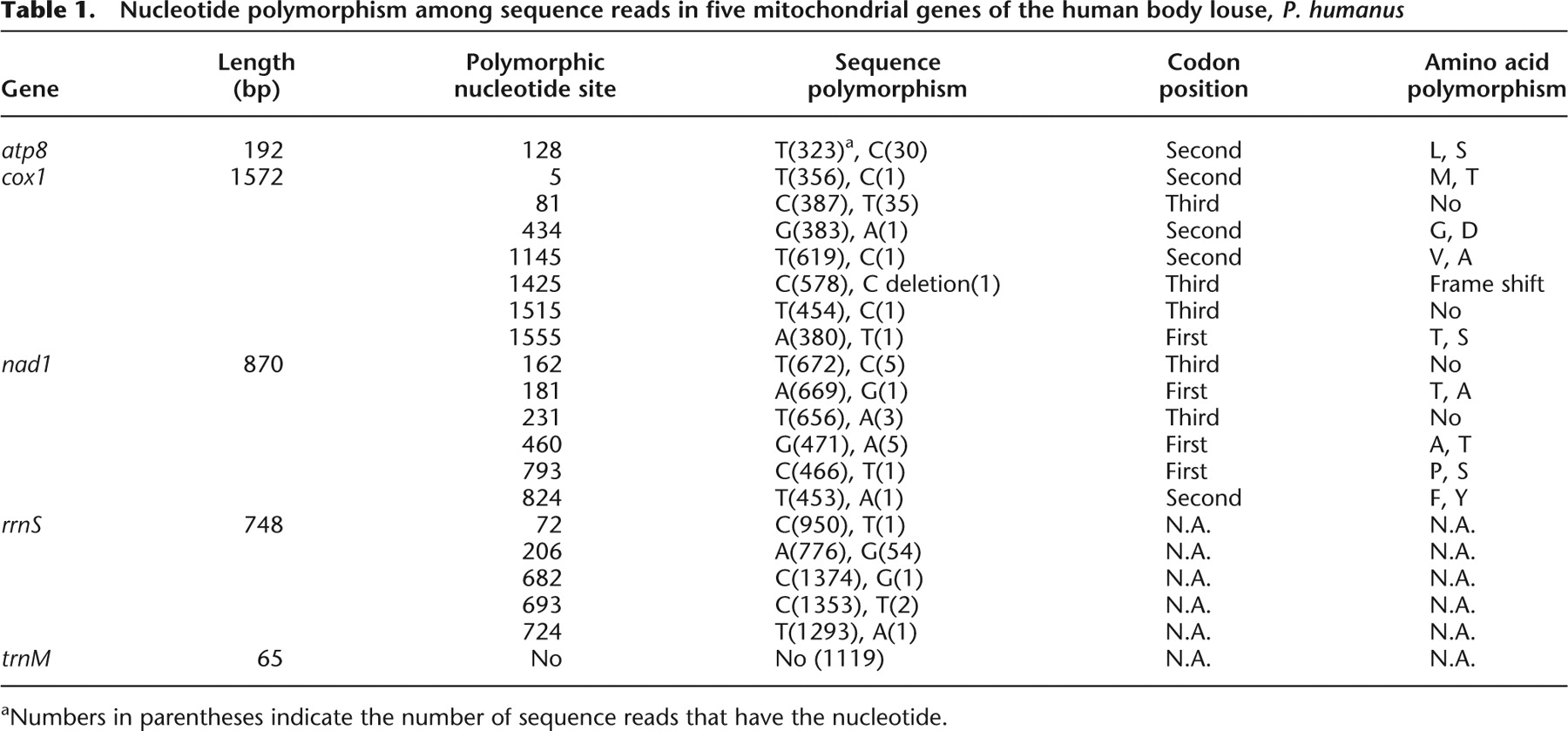 Nucleotide polymorphism among sequence reads in five mitochondrial genes of the human body louse, P. humanus