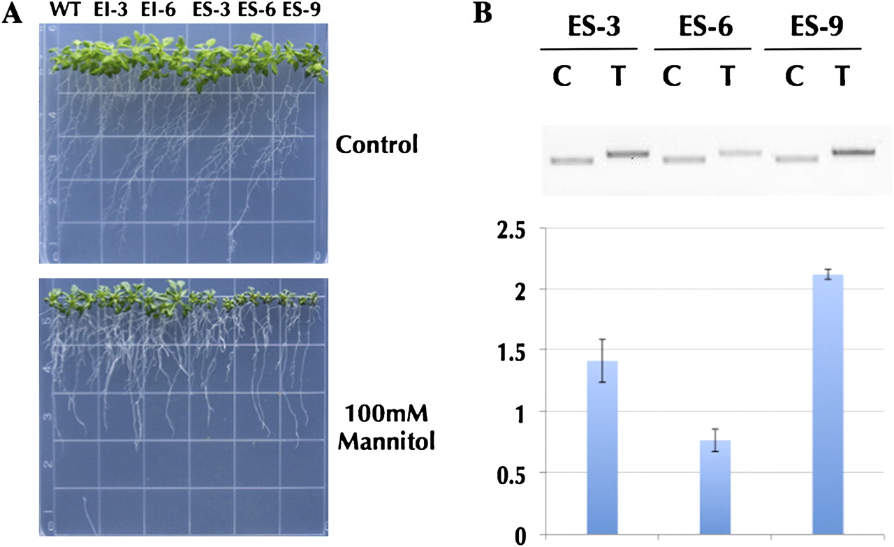 Phenotypes of transgenic Arabidopsis lines overexpressing EI and ES isoforms of TFIIIA under osmotic stress. (A) Overexpressing TFIIIA-EI lines (EI-3,6) and TFIIIA-ES lines (ES-3, 6, 9) and Col-0 as wild type (WT) without (top) and with (bottom) treatment of 100 mM mannitol. (B) Relative accumulation levels of TFIIIA transgene mRNA (T) in ES-3, ES-6, and ES-9 using Tubulin 8 (TUB8) as a reference gene (C).