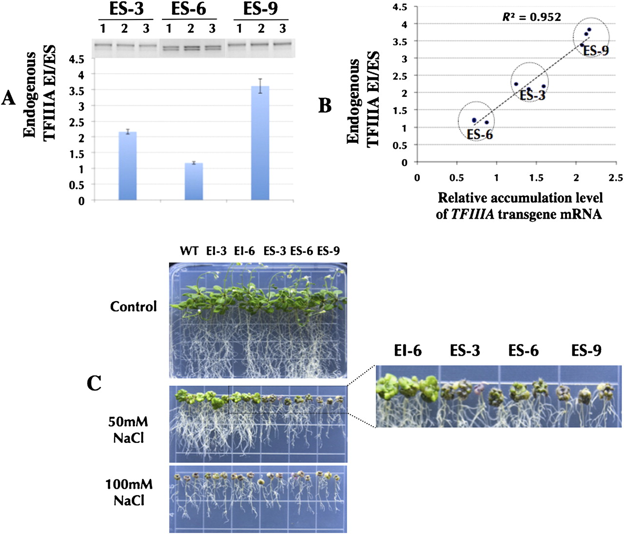 Strong accordance between molecular and phenotypic evidences in multiple independent transgenic Arabidopsis lines overexpressing TFIIIA under salt stress. (A) mRNA accumulation ratio of endogenous TFIIIA EI to ES isoform in ES-3, ES-6, and ES-9 lines. Quantification (bottom) with three replicates for each line. (B) The high positive correlation (R2 = 0.952) between the relative accumulation level of TFIIIA transgene mRNA and mRNA accumulation ratio of endogenous TFIIIA EI to ES isoform in ES-3, ES-6, and ES-9 lines with three replicates for each line. (C) Overexpression lines without (top) and with treatments of 50 mM NaCl (middle) and 100 mM NaCl (bottom).