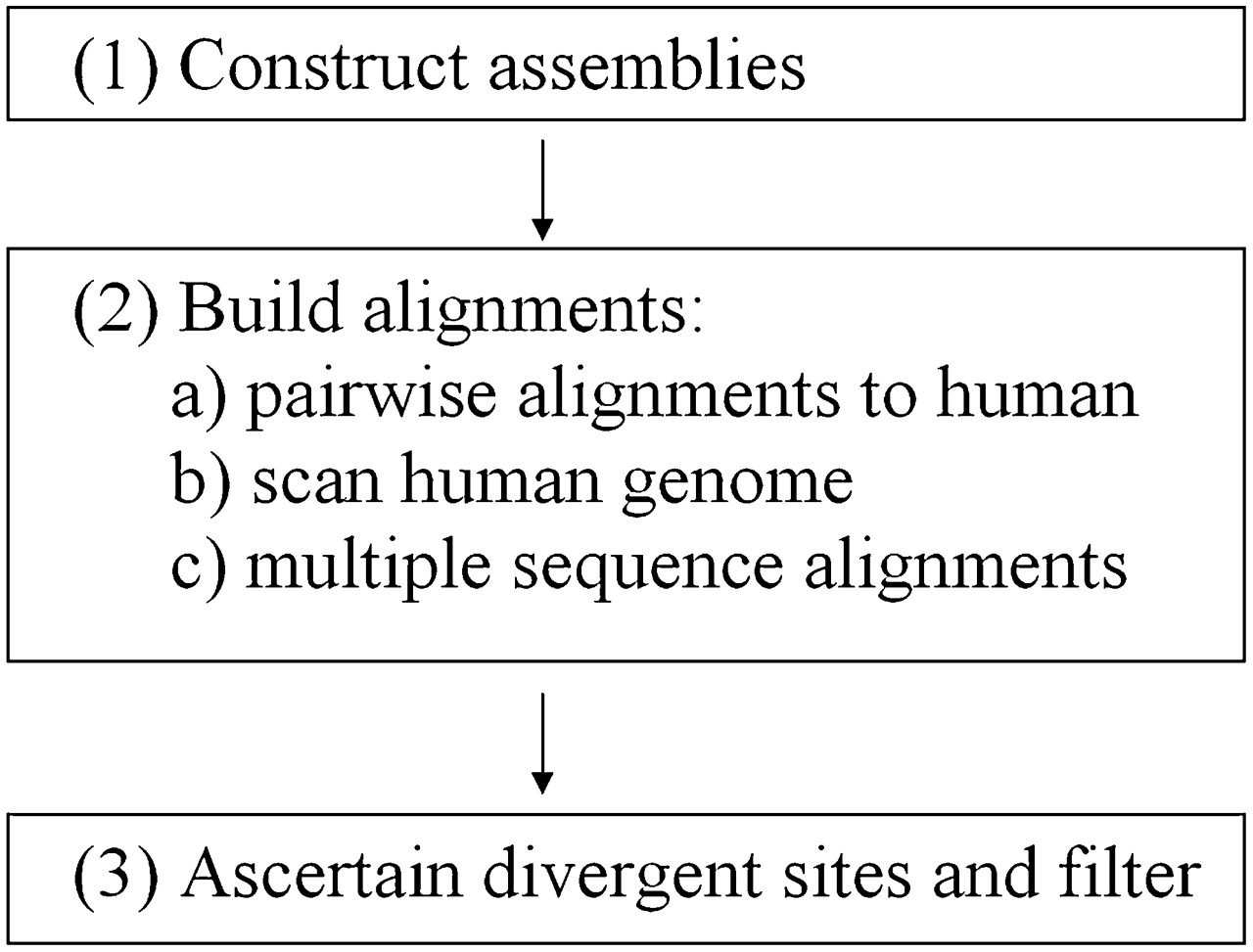 Alignment pipeline. Flowchart of our bioinformatic procedure for generating multiple sequence alignments. For non-human species in step 1, publicly available traces are turned into genome assemblies using ARACHNE (Jaffe et al. 2003). This allows us to construct a synteny map and to use assembly information to guide the positioning of the non-human sequence on the reference (human) genome. In step 2, pairwise alignments of non-human sequence with its human counterpart are constructed using synteny information and information on the uniqueness of the alignment to filter out spurious alignments and regions of duplication. BLASTZ (Schwartz et al. 2003) is used to generate local alignments that are then combined to create a nonoverlapping pairwise alignment, allowing for the possibility of local inversions. The human genome is scanned to determine regions that have alignments to all the non-human species. Multiple sequence alignments are constructed using ClustalW (Larkin et al. 2007). In step 3, alignments are scanned to determine divergent sites, after which aggressive filters are applied (see Methods).