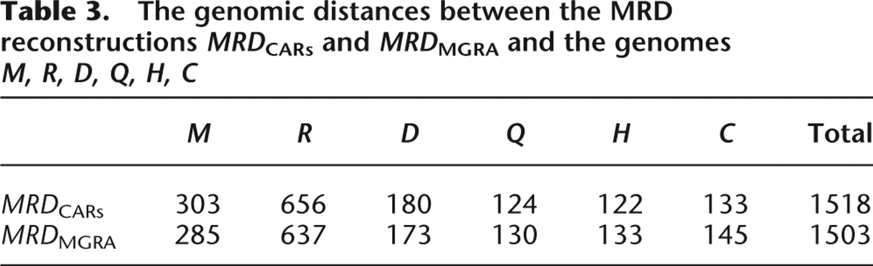 The genomic distances between the MRD reconstructions MRDCARs and MRDMGRA and the genomes M, R, D, Q, H, C
