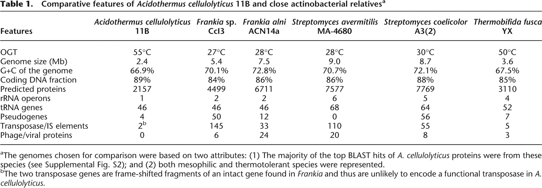 Comparative features of Acidothermus cellulolyticus 11B and close actinobacterial relativesa