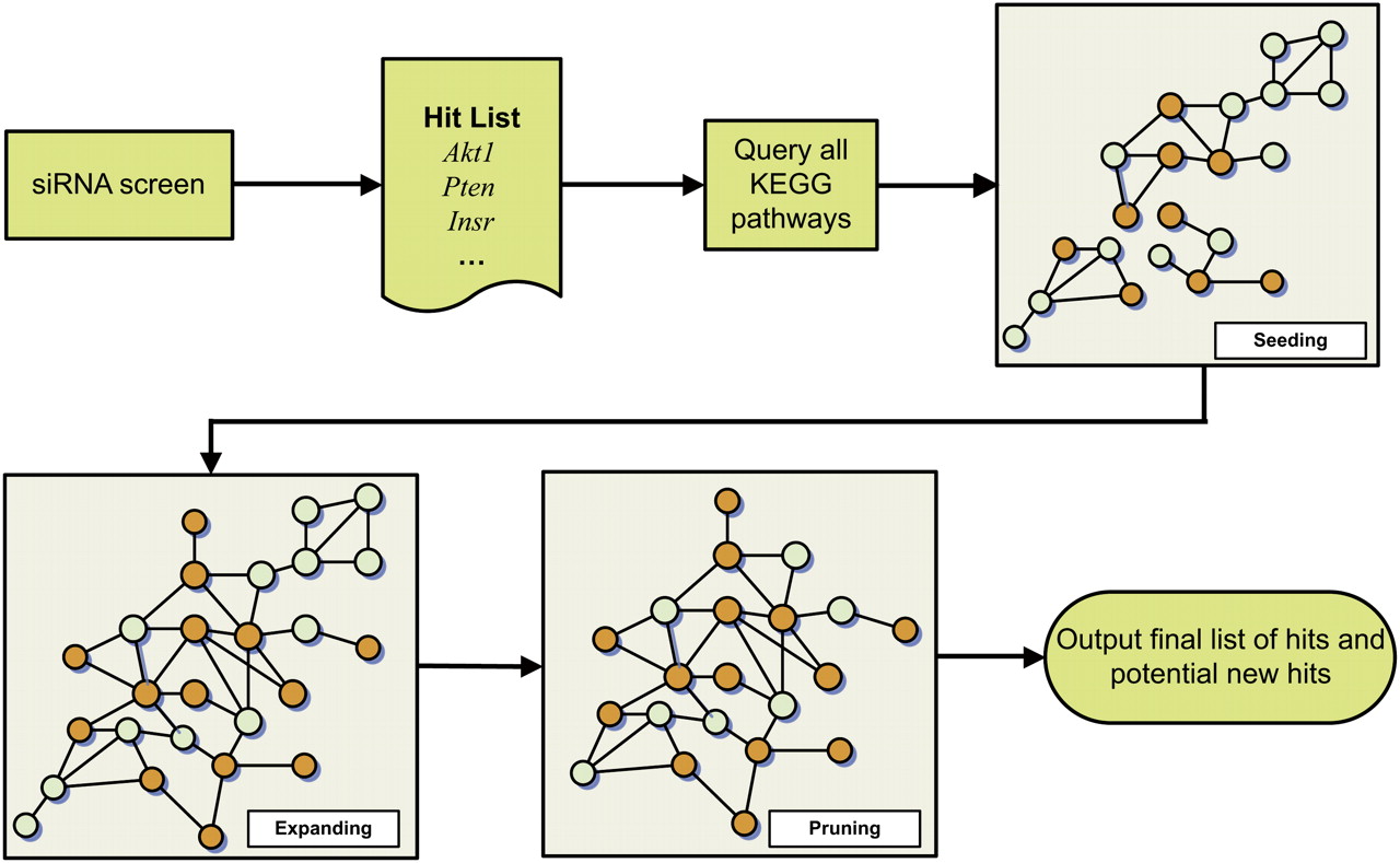Flow diagram for the PEXA network reconstruction process. This reconstruction process consists of four steps: (1) perturbing genes of interest using siRNA to identify those that produce the desired phenotype (referred to here as the hit list); (2) querying through all the pathways in the KEGG database with the hit list to identify seeding paths; (3) expanding the seeding paths using PPI data to obtain a more coherent network relating to the biological process of interest (insulin signaling in this case); and (4) pruning the network obtained in step 3 to enhance the biological coherence of the network with respect to the biological processes of interest. In the hypothetical networks depicted in this figure, the orange nodes correspond to genes in the siRNA hit list, while the blue nodes are supported by the KEGG and/or PPI data as operating in the same part of the network as the hit list genes.