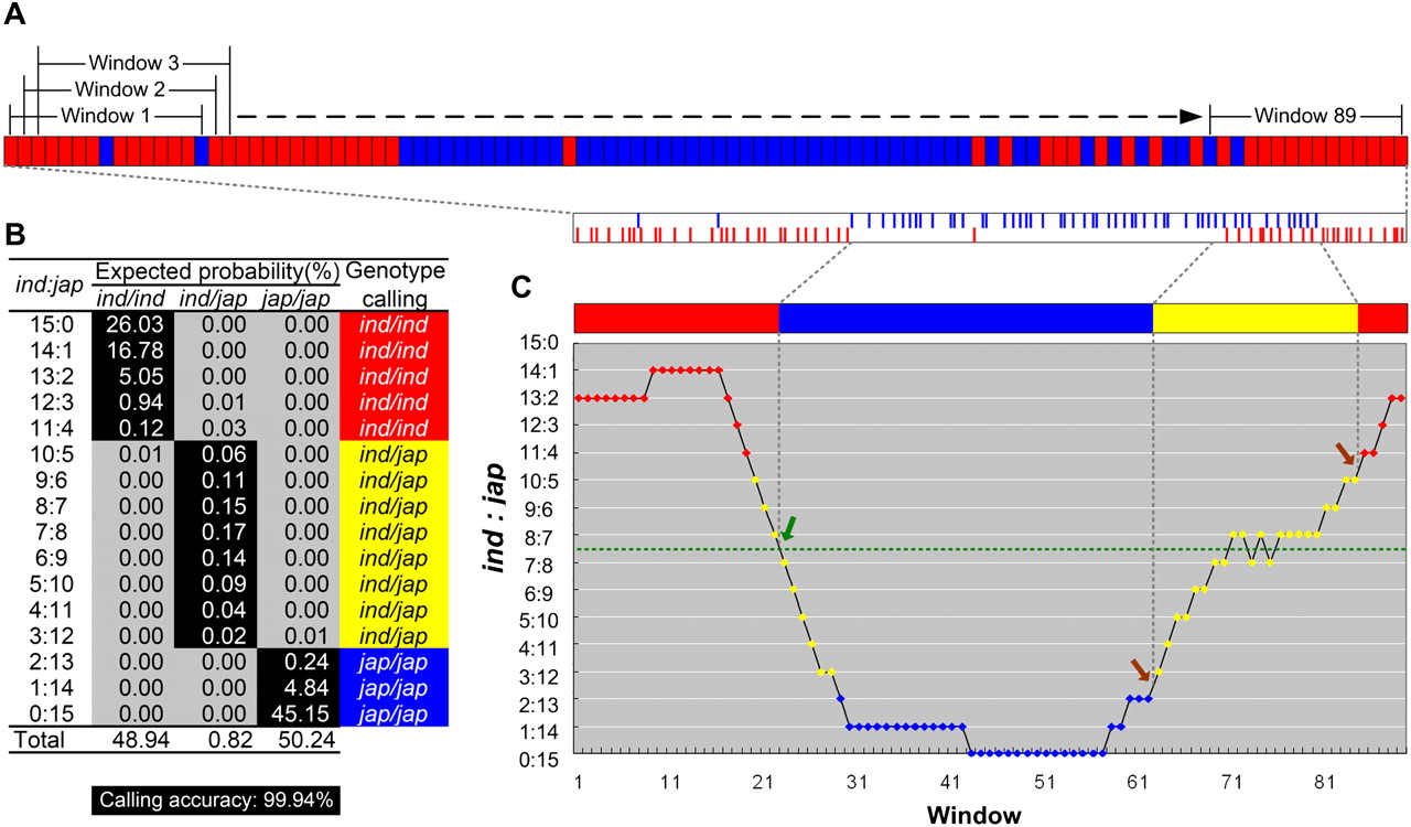 Sliding window approach for genotype calling and recombination breakpoint determination. (A) The top stripe of blocks represents SNPs along the hypothetical chromosomal region. This was redrawn from the two stripes of short vertical lines below illustrating SNPs detected by aligning 33-mers with the parental genome sequences. (Red) Indica genotype; (blue) japonica genotype. A sliding window covering 15 SNPs moves from left to right one base at a time. For each window, the ratio of the number of indica to japonica SNPs (ind:jap) is calculated. (B) Genotype calling based on the highest expected probabilities: Call homozygous indica genotype (ind/ind) when ind:jap ≥ 11:4; call heterozygous genotype (ind/jap) when 10:5 ≥ ind:jap ≥ 3:12; call homozygous japonica genotype (jap/jap) when ind:jap ≤ 2:13. Adding together the probabilities of these callings (shaded in black) gives the calling accuracy of 99.94%. (C) As the window slides, genotypes are called and recombination breakpoints are determined. Green and brown arrows point to breakpoints between two homozygous genotypes and between the heterozygous and homozygous genotypes, respectively. The resulting recombination map for this chromosomal region is illustrated in a solid bar, in which red, blue, and yellow represent genotypes ind/ind, jap/jap, and ind/jap, respectively. Identified breakpoints are indicated between SNPs.