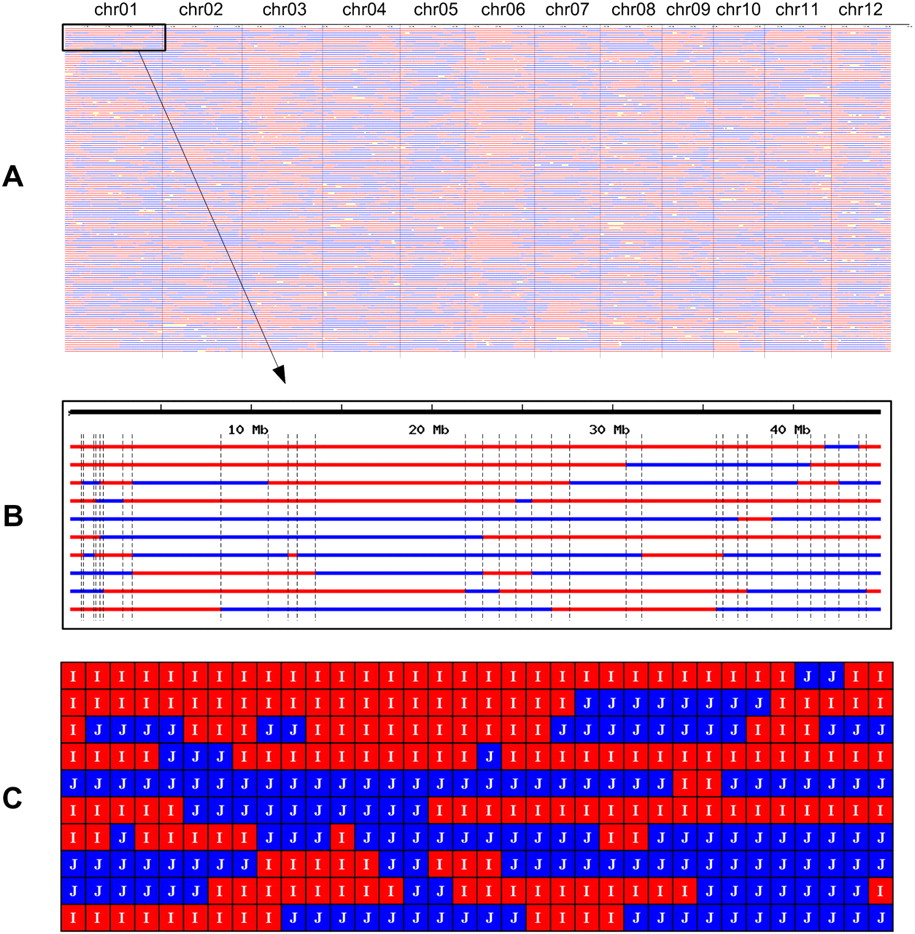 Recombination and bin maps. (A) Aligned recombination maps of 150 rice RILs. Red, ind/ind; blue, jap/jap; yellow, ind/jap. (B) Aligned chromosome 1 of the first ten RILs. Scale indicates physical distance. A vertical line labels a recombination breakpoint. A region between two vertical lines across all RILs is recognized as a recombination bin. (C) Bin map of the 10 RILs.