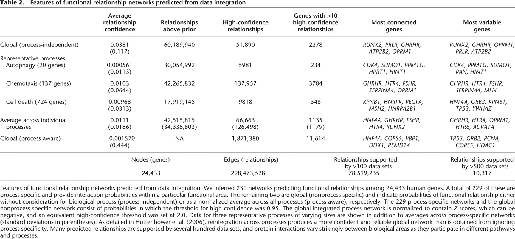 Features of functional relationship networks predicted from data integration. We inferred 231 networks predicting functional relationships among 24,433 human genes. A total of 229 of these are process specific and provide interaction probabilities within a particular functional area. The remaining two are global (nonprocess specific) and indicate probabilities of functional relationship either without consideration for biological process (process independent) or as a normalized average across all processes (process aware), respectively. The 229 process-specific networks and the global nonprocess-specific network consist of probabilities in which the threshold for high confidence was 0.95. The global integrated-process network is normalized to contain Z-scores, which can be negative, and an equivalent high-confidence threshold was set at 2.0. Data for three representative processes of varying sizes are shown in addition to averages across process-specific networks (standard deviations in parentheses). As detailed in Huttenhower et al. (2006), reintegration across processes produces a more confident and reliable global network than is obtained from ignoring process specificity. Many predicted relationships are supported by several hundred data sets, and protein interactions vary strikingly between biological areas as they participate in different pathways and processes.
