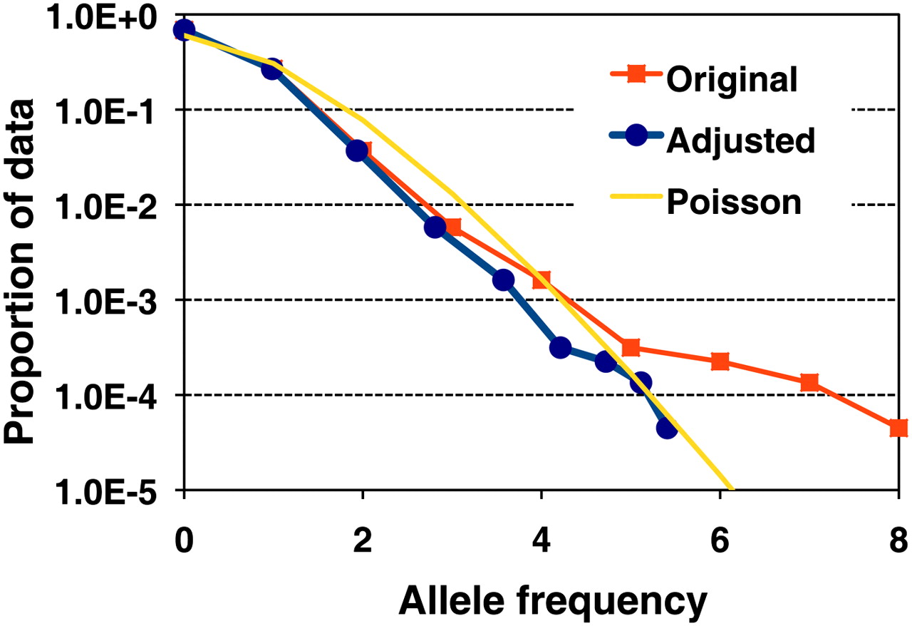 Effective allele frequency of incorrect alleles before and after adjusting reads with identical mapping location. We calculated the frequency of the alleles in the Asian genome sequencing reads that are different from the genotyping results. The frequency contributed by the n-th reads with the same mapping location was multiplied by θn, where 0 ≤ θ ≤ 1. The original, adjusted frequency and Poisson distribution are shown.