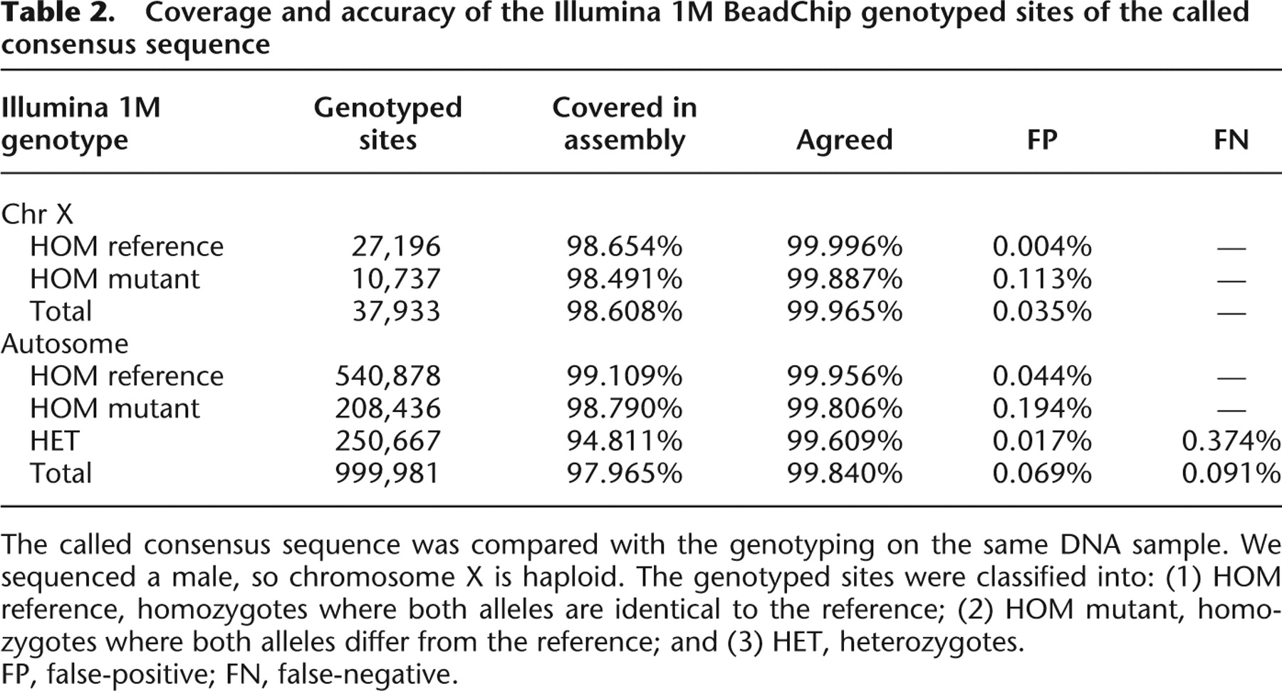 Coverage and accuracy of the Illumina 1M BeadChip genotyped sites of the called consensus sequence