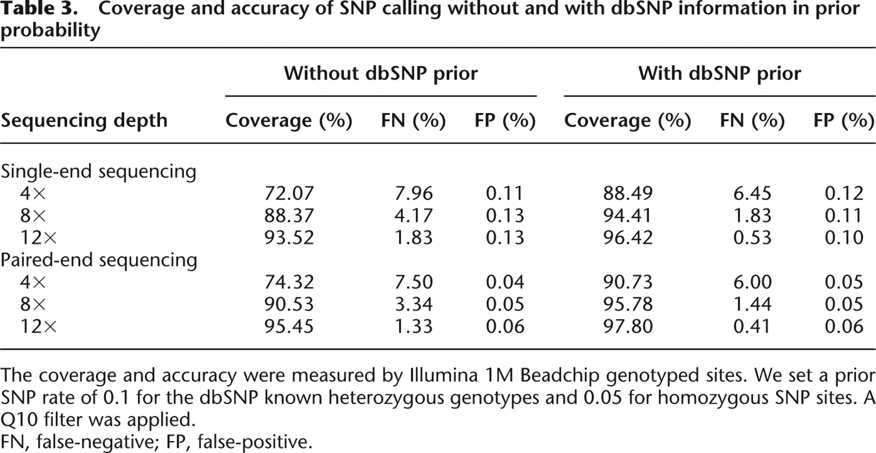 The coverage and accuracy were measured by Illumina 1M Beadchip genotyped sites. We set a prior SNP rate of 0.1 for the dbSNP known heterozygous genotypes and 0.05 for homozygous SNP sites. A Q10 filter was applied.