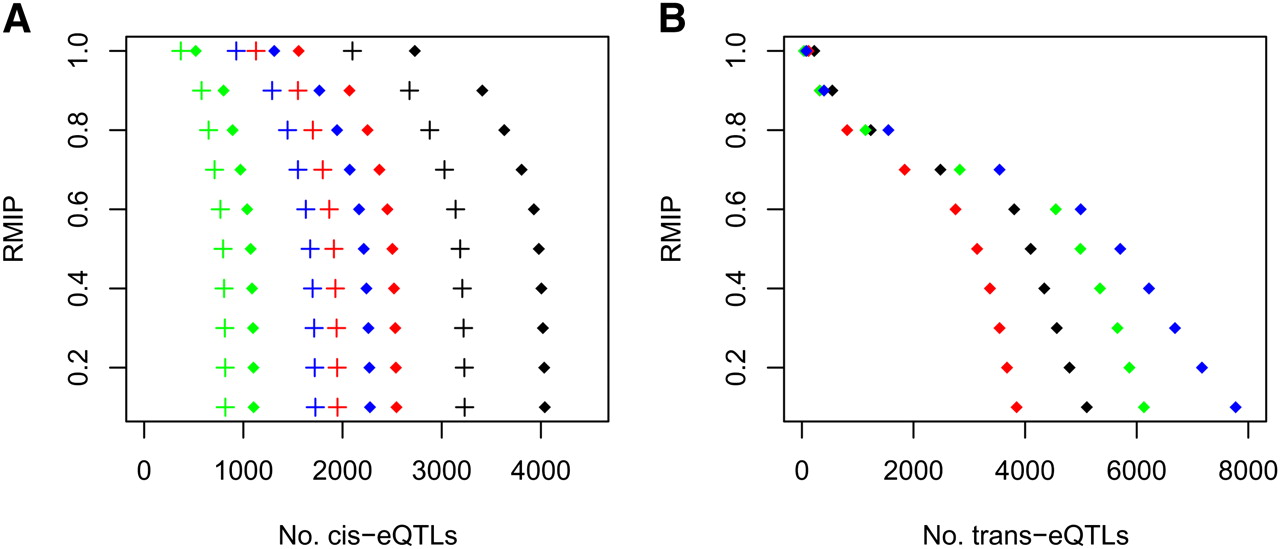 (A) The number of cis-eQTLs for each of three tissues at different RMIP thresholds (vertical axis). Numbers are shown for cis-eQTLs containing no annotated SNPs (crosses) and for all cis-eQTLs (diamonds). Lung data are shown in blue, liver in green, and hippocampus in red (260 animals) and black (460 animals). (B) The number of trans-eQTLs for each of three tissues at different RMIP thresholds (vertical axis). Lung data are shown in blue, liver in green, and hippocampus in red (260 animals) and black (460 animals).