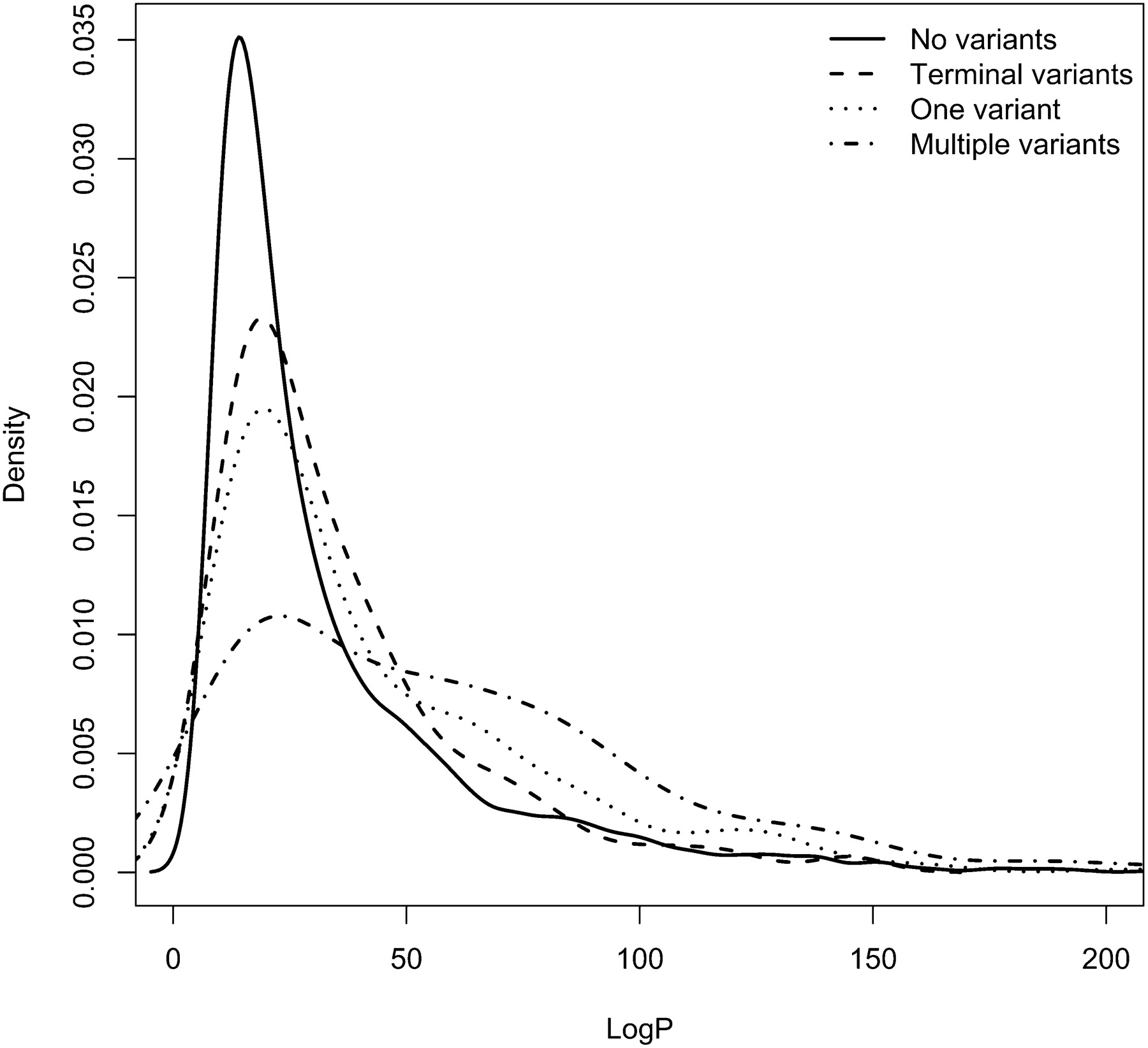 Effect of sequence variants on cis-eQTL detection. The frequency (vertical axis) of logP (negative logarithm of the P-value) scores (horizontal axis) for cis-acting eQTLs is shown. Data for cis-eQTLs with no annotated variant (solid line) are compared with data for cis-eQTLs with terminal variants (a SNP in the first two or last base pairs of the probe sequence) and with central variants (defined as any SNP that is not a terminal variant).