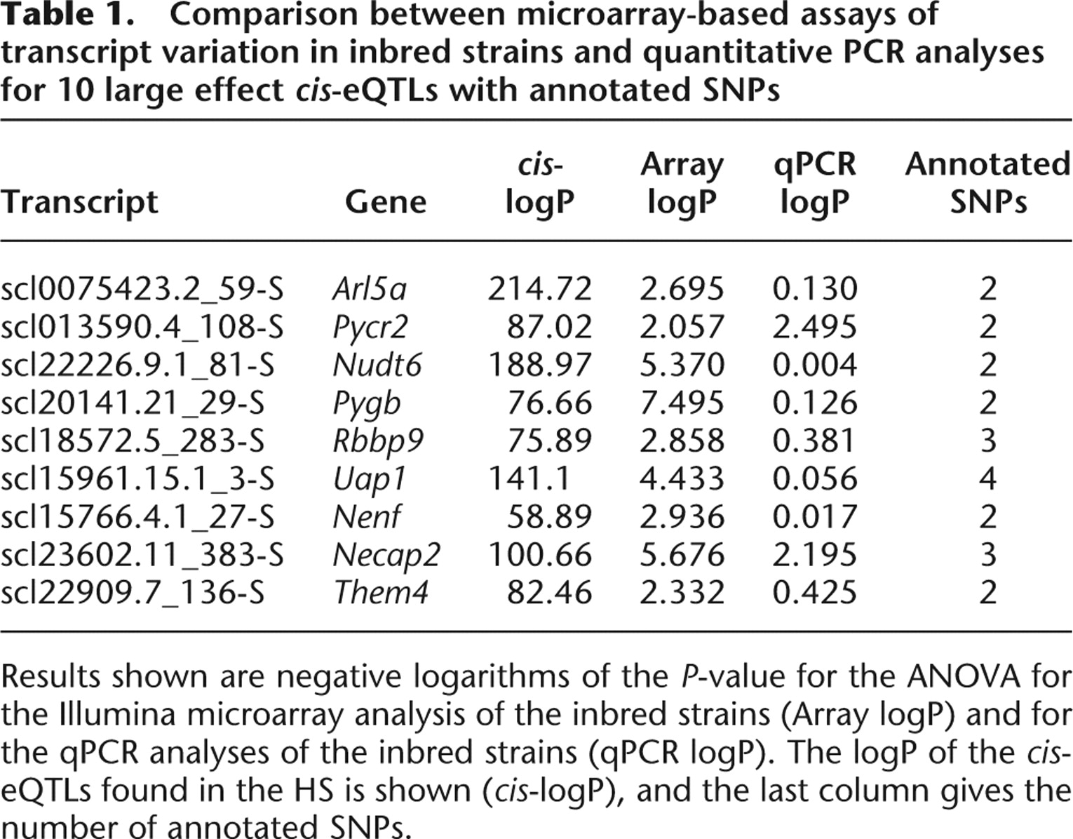 Results shown are negative logarithms of the P-value for the ANOVA for the Illumina microarray analysis of the inbred strains (Array logP) and for the qPCR analyses of the inbred strains (qPCR logP). The logP of the cis-eQTLs found in the HS is shown (cis-logP), and the last column gives the number of annotated SNPs.