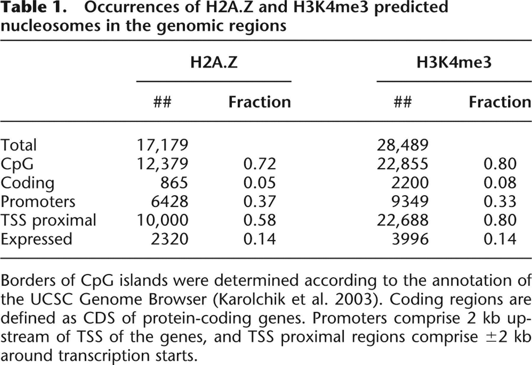 Occurrences of H2A.Z and H3K4me3 predicted nucleosomes in the genomic regions