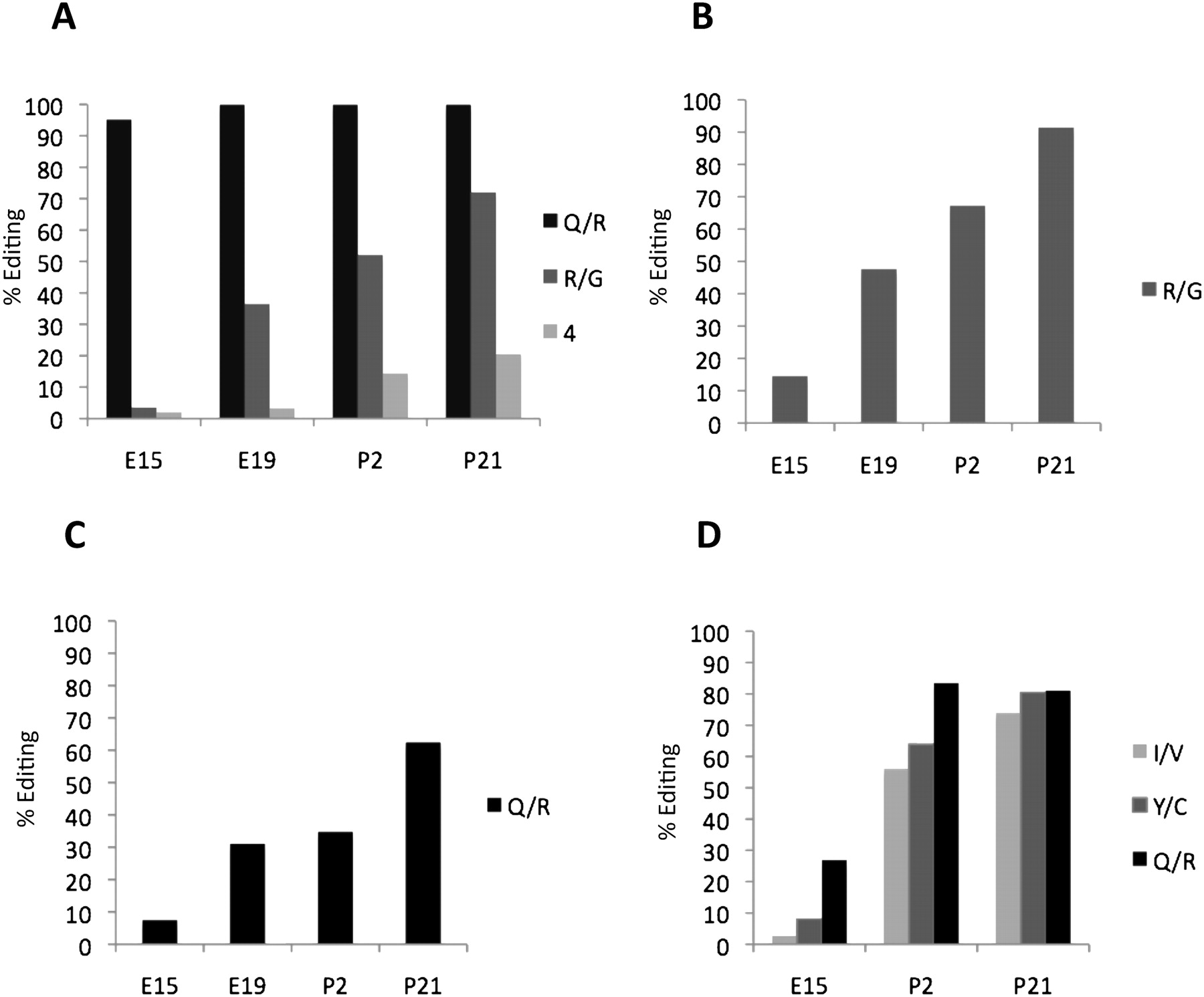 Editing levels of the glutamate receptor transcripts at four different developmental stages; E15, E19, P2, and P21 of the mouse brain determined by 454 Amplicon Sequencing after RT-PCR. (A) The percentage of transcripts edited at Q/R site, the nearby +4 site, and the R/G site in Gria2. (B) Editing frequency at the R/G position of the Gria3 transcripts. (C) The level of editing at the Q/R site of the Grik1 transcripts. (D) Editing frequency at the Q/R, Y/C and I/V sites of the Grik2 transcripts.