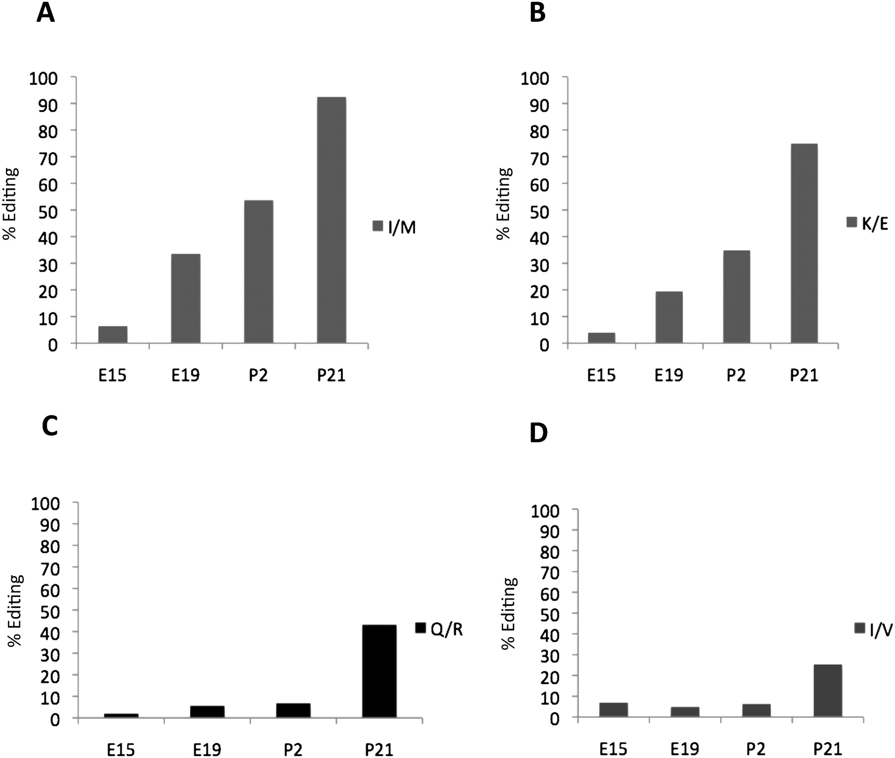 Efficiency of editing in the transcripts of Gabra3, Cyfip2, Flna, and Kcna1 at four developmental stages, E15, E19, P2, and P21 of the mouse brain determined by 454 Amplicon Sequencing. (A) Editing frequency at the I/M site of Gabra3 transcripts. (B) Editing frequency at the K/E site of Cyfip2 transcripts. (C) Editing frequency at the Q/R site of Flna transcripts. (D) Editing levels at the I/V site of the Kcna1 transcripts.