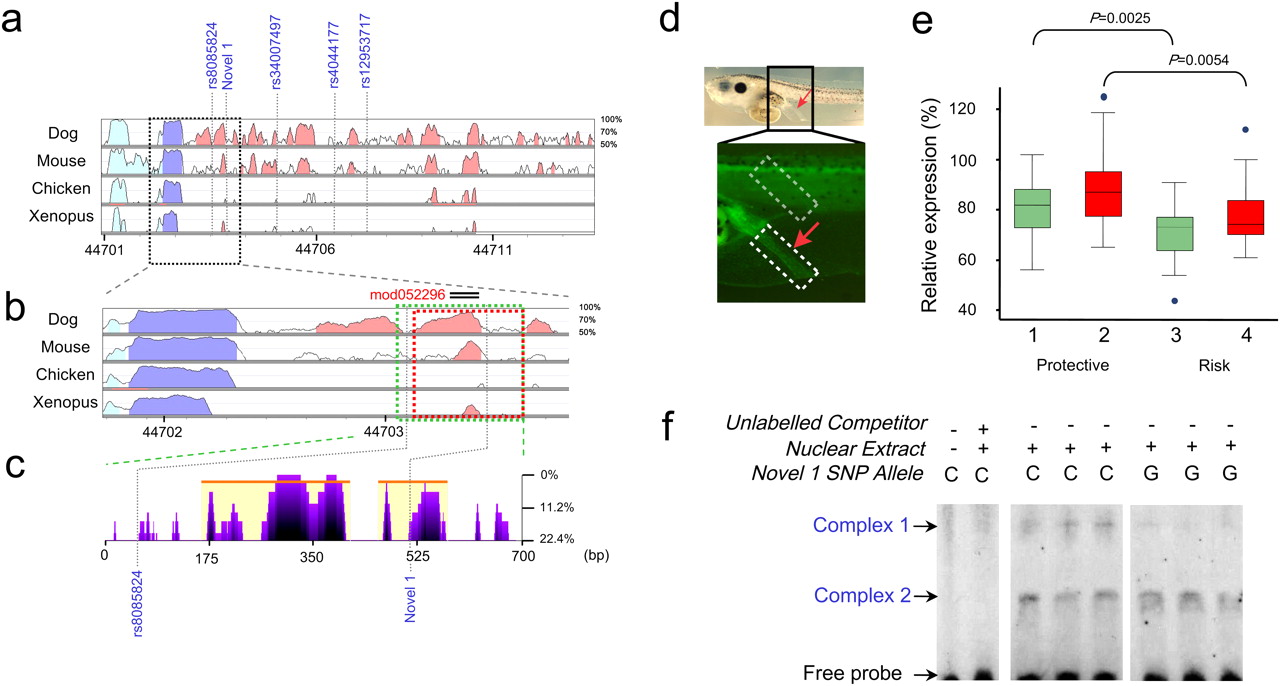 (a) VISTA view of the occurrence of conserved sequence domains in the SMAD7 risk-associated region. Shown from top to bottom are global alignments of human vs. dog, mouse, chicken, and Xenopus tropicalis, respectively. Colored peaks indicate regions of at least 100 bp in length and with 75% sequence similarity. Cyan peaks are UTR, purple peaks are coding regions, and pink peaks are noncoding regions. (b) Detail of the genomic regions used in the Xenopus functional enhancer assays (green and red blocks). Note that this region contains an evolutionarily-conserved noncoding peak. (c) eShadow view (ClustalW multiple sequence alignments presented as percent mismatch) of the SMAD7 construct showing regions of sequence conservation amongst primates (Human, Chimp, Orangutan, Rhesus, and Marmoset). Note that SNP Novel 1 is conserved in primates. (d) The tested regions contain an enhancer that promotes reporter gene expression in the rectal region of Xenopus tadpoles. The bright field image above shows a 5-d tadpole embryo. The rectal region is indicated by a red arrow. The fluorescent image below shows a detail of the rectal region of a Xenopus transgenic embryo in which GFP expression is promoted by the enhancer. The intensity of the rectal expression promoted by the enhancer from the Protective or the Risk haplotypes was measured relative to the signal observed in a fixed area in the muscles region (boxed in gray), which was considered as 100%. The DNA tested contains either the protective or risk variants of both rs8085824 and Novel 1 (green; 1 and 3) or solely Novel 1 (red; 2 and 4). (e) Box-whisker plot of the relative expression observed in transgenic embryos harboring the Protective or the Risk DNA promoting GFP expression. The enhancer from the risk haplotype/allele shows a significantly decreased enhancer activity. (f) EMSA revealing allele-specific binding of unknown nuclear factors at Novel 1 SNP.