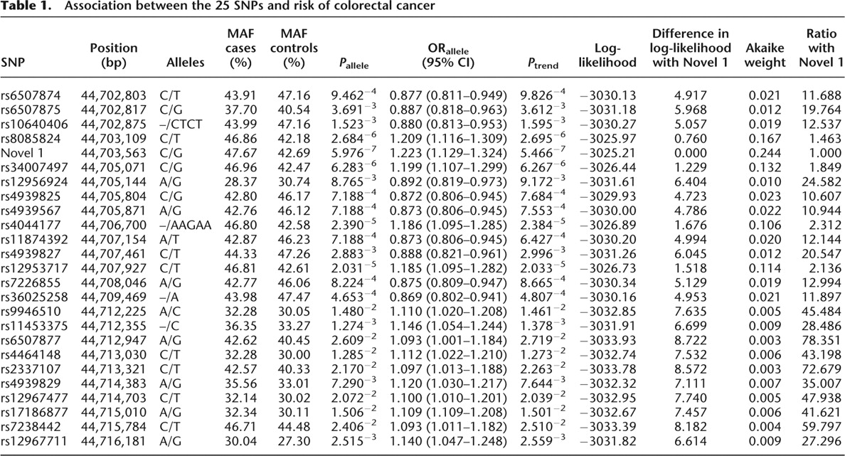 Association between the 25 SNPs and risk of colorectal cancer