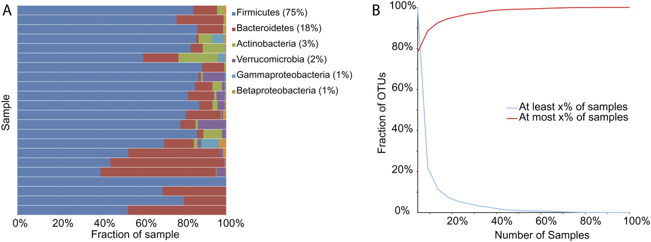 (A) Phylum-level abundance and (B) shared “species” (represented here as 97% OTUs, approximately species level) in 22 human gut samples with depth of coverage of at least 350 sequences per individual. These data are taken from a meta-analysis (Ley et al. 2008a) covering several large Sanger-sequencing studies of humans in different populations (Suau et al. 1999; Hayashi et al. 2002a,b, 2003; Eckburg et al. 2005; Ley et al. 2006c; Nagashima et al. 2006). Interestingly, the results are very consistent with results from both Sanger sequencing and pyrosequencing within a North American population of lean and obese twins (Turnbaugh et al. 2009). Note: No species-level OTUs were shared across all samples with 350 sequences per sample; 1813 OTUs were only present in one sample; the total number of OTUs was 2320.