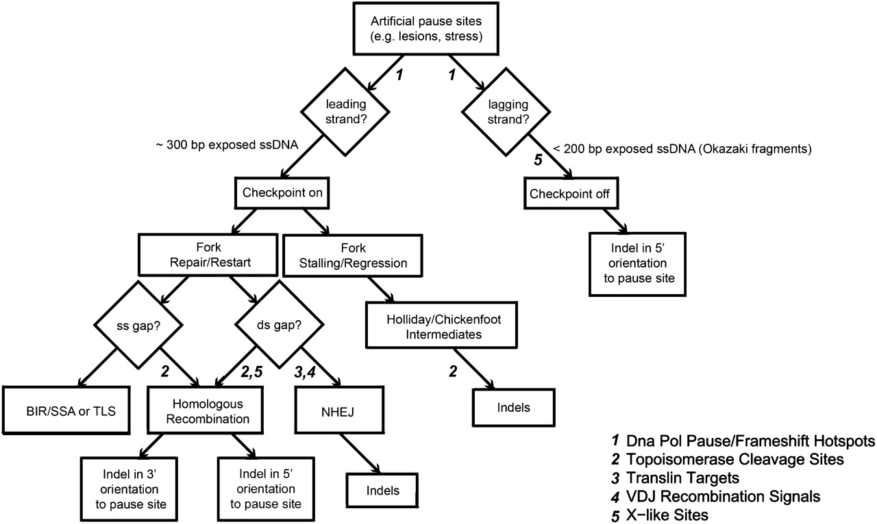 Replication and recombination pathways proposed to contribute to insertion and deletion mutagenesis (numbers correspond to motif classes indicating involvement as evidenced by results; for details, see Discussion). DNA replication can pause when encountering natural pause sites or artificially due to lesions, stress, and/or specific sequence cues. Depending on the strand, single-stranded DNA (ssDNA) is exposed and replication checkpoint can be triggered or bypassed. Cells respond to replication pausing by repair or restart of the forks, depending on the type of lesion created at the paused site. Double-strand gaps are repaired via homologous recombination or nonhomologous end joining (NHEJ), whereas single-stranded gaps can be repaired via homologous recombination, break-induced replication (BIR) followed by single-strand annealing (SSA), or translesion synthesis (TLS). Our results confirm that NHEJ repair of double-stranded gaps and homologous recombination (of double- and/or single-stranded gaps) could contribute to indel mutagenesis. Stalling of the fork can result in regression and Holliday junction/chickenfoot intermediates, which can be repaired and thus cause indel formation. Checkpoint bypass can also lead to indels.