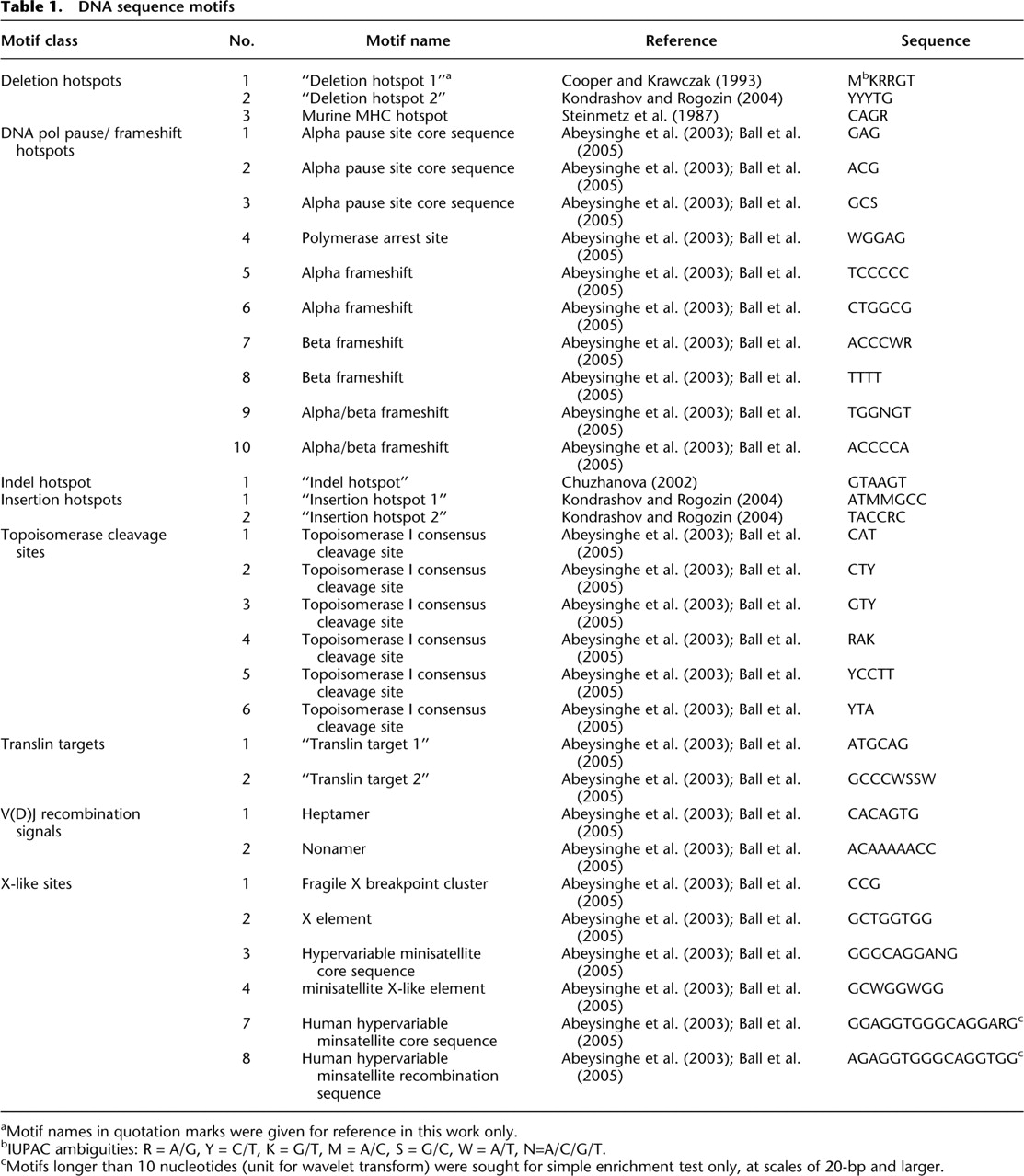 bIUPAC ambiguities: R = A/G, Y = C/T, K = G/T, M = A/C, S = G/C, W = A/T, N=A/C/G/T.