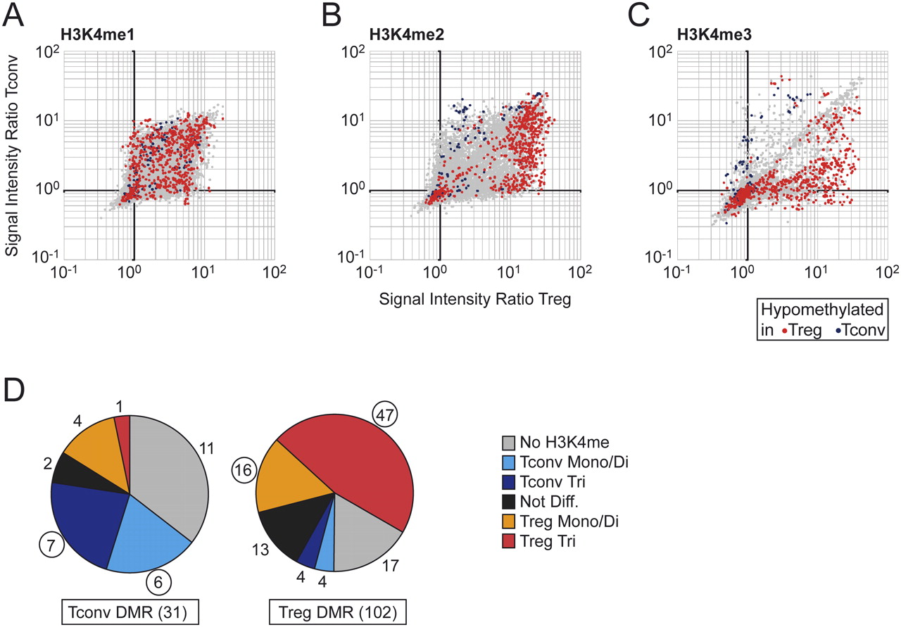 Correlation of DNA demethylation and H3K4 methylation status. (A–C) Probe signal ratios of Tconv and Treg cells are plotted against each other for ChIP-chip experiments of monomethylated (A), dimethylated (B), and trimethylated (C) lysine 4 of histone H3. Probes that appear along the diagonal indicate similar H3K4 methylation levels, whereas probes above or below the diagonal indicate higher methylation levels in Tconv or Treg cells, respectively. Probes in DMRs: (blue) unmethylated in Tconv; (red) unmethylated in Treg; (gray) all other probes. (D) The two pie charts illustrate the relationship of associated H3K4 methylation and DMRs hypomethylated in Tconv (left) or Treg (right). The H3K4 methylation status was classified as follows: DMRs with increased H3K4 trimethylation in Treg or Tconv cells (Treg Tri or Tconv Tri, respectively); DMRs with increased H3K4 mono- or dimethylation, but no trimethylation, in Treg or Tconv cells (Treg or Tconv Mono/Di respectively); DMRs with H3K4 methylation present but no difference between T cell subsets (Not diff.); and DMRs with no detectable H3K4 methylation (No H3K4me). The numbers of DMRs in each subclass are shown next to each piece of pie. Circled numbers indicate subclasses where hypomethylation in one cell type correlates with an increased level of H3K4 methylation in the same cell type.