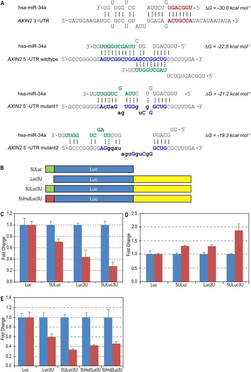 Human miRNA hsa-miR-34a and target AXIN2. (A) Predicted interactions between hsa-miR-34a and AXIN2 UTR sequences. Extended seed match between the 5′-end of miR-34a and one of the 3′-UTR binding sites is shown in bold red. All predicted 3′-UTR sites are marked in the Supplemental material. Overlapping interactions between the 3′-end of miR-34a and the 5′-UTR inserted sequences are shown in bold blue. Energy was calculated using RNAhybrid. (B) Schematic showing vector constructs containing firefly luciferase reporter gene used in transfection experiments. The 5′-UTR and 3′-UTR inserts are indicated as 5U and 3U, respectively. (C) Luciferase expression fold change with miR-34a (red bars) normalized with negative control RNA oligo (blue bars). Firefly luciferase protein expression was normalized with Renilla luciferase protein. (D) Reporter constructs were co-transfected with anti-miR-34a oligo (red bars, Ambion, product ID, AM11030) and normalized with negative control RNA oligo (blue bars). (E) Effect of mutations in the 5′-UTR site—luciferase protein levels when reporter constructs were co-transfected with miR-34a (red bars) or negative control (blue bars). Error bars in panels C–E represent standard deviation from triplicate experiments.