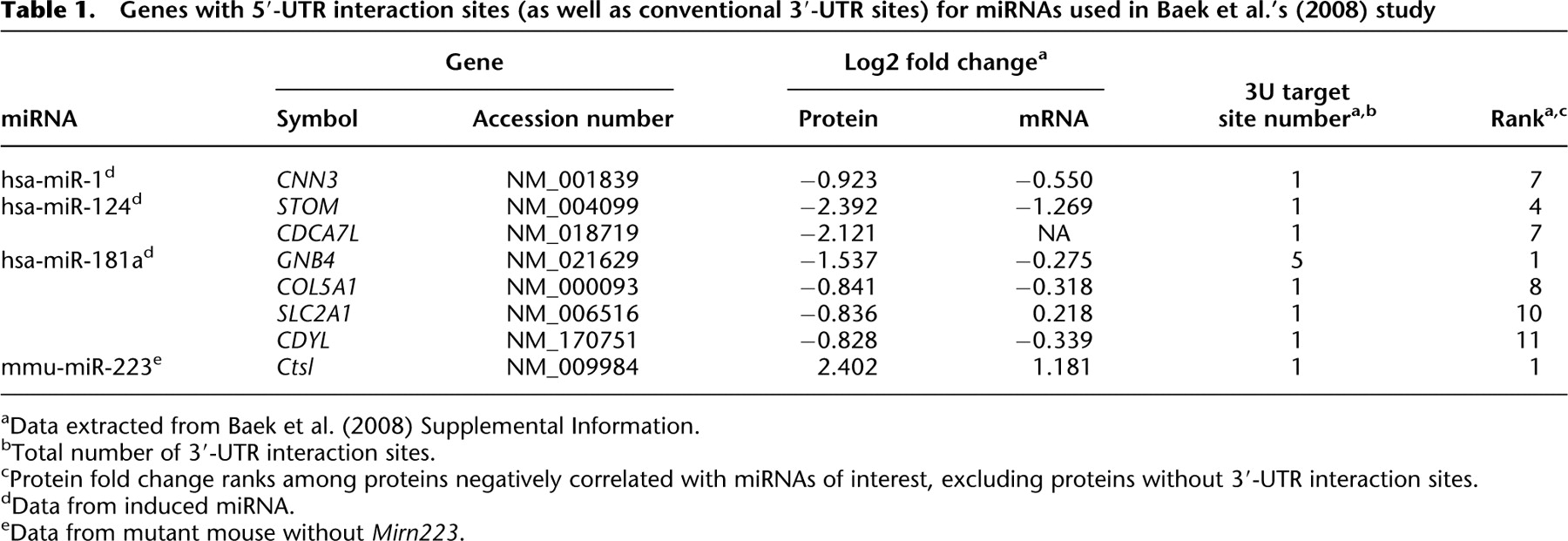 Genes with 5′-UTR interaction sites (as well as conventional 3′-UTR sites) for miRNAs used in Baek et al.'s (2008) study