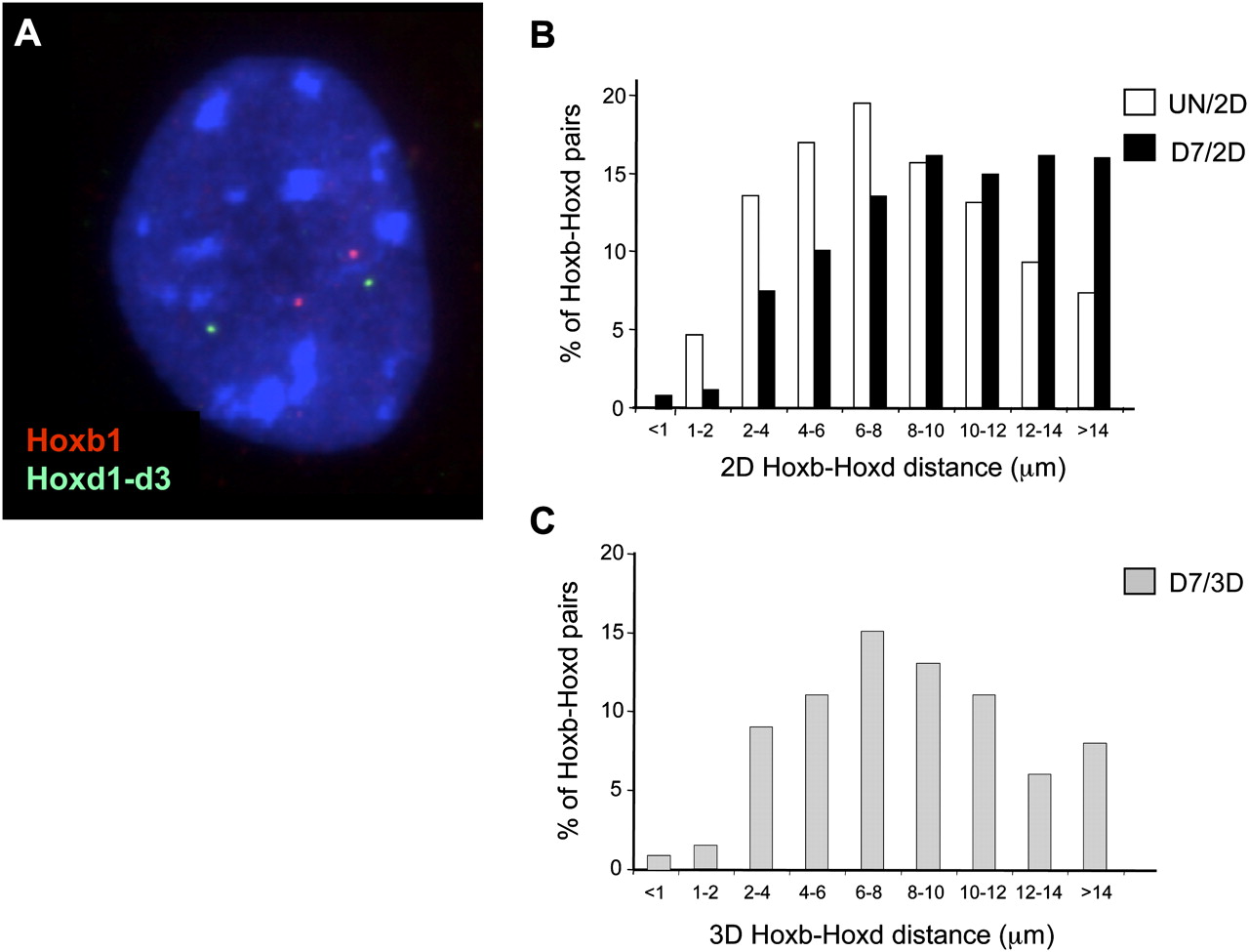 Spatial proximity between Hoxb1 and Hoxd1 loci. (A) Three-color DNA-FISH on DAPI counterstained nucleus from a differentiated (7 d) OS25 ES cell using probe for Hoxb1 (BAC MMP-4; as in Chambeyron and Bickmore [2004]) in red, and fosmid probe for Hoxd1-d3 (WI1-121N10) in green. (B) Histogram showing the distribution of distances between the Hoxb and Hoxd signals measured by 2D FISH in nuclei from undifferentiated and differentiated (7 d) cells (59 and 87 nuclei analyzed, respectively). Distances are slightly larger in differentiated cells due to the increased nuclear volume. (C) As in B but using 3D FISH on pFa fixed cells.