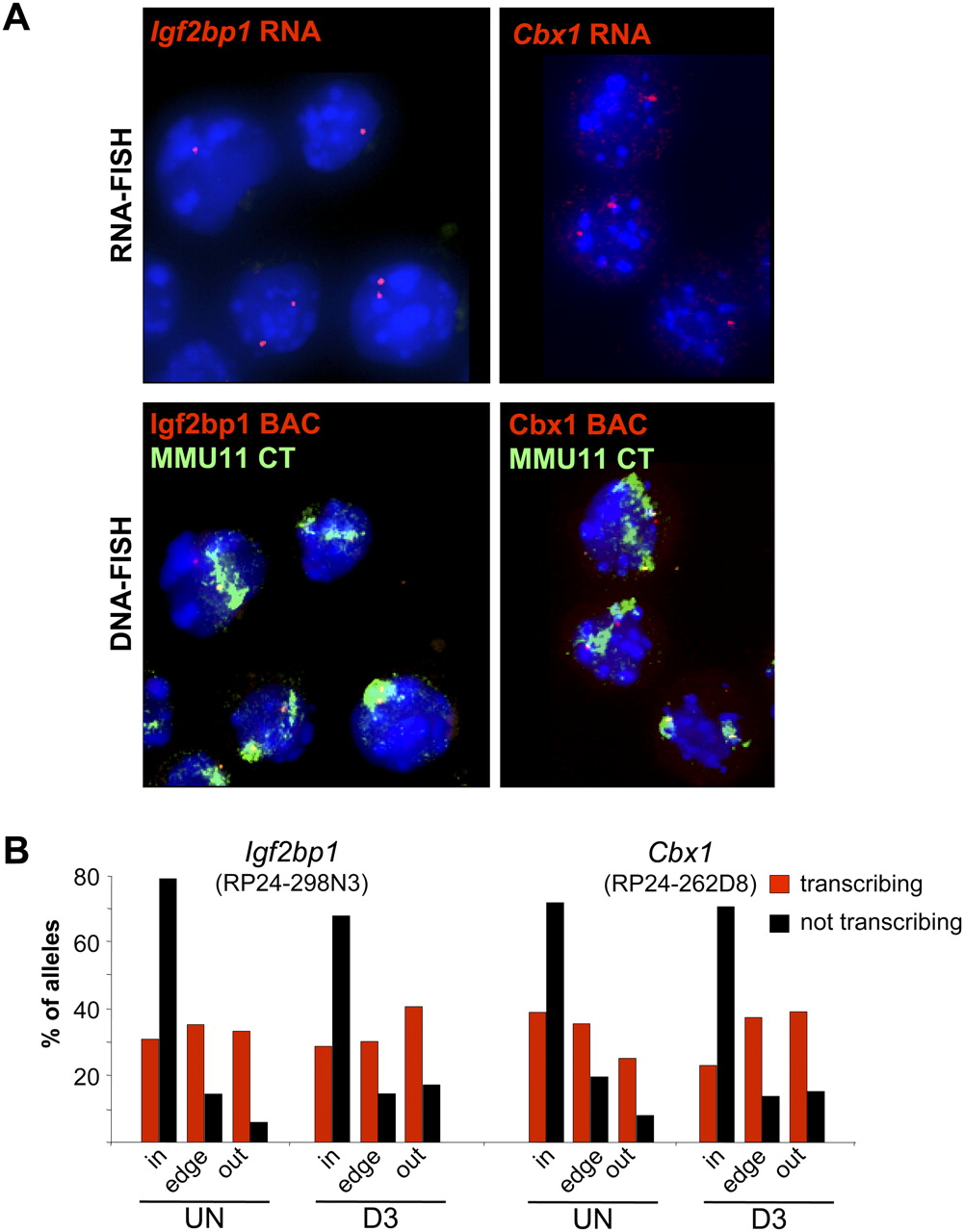 Nuclear organization of actively transcribing alleles. (A) (Top panels) RNA-FISH with Igf2bp1 or Cbx1 intronic probes (red) on DAPI counterstained nuclei of cytospun OS25 ES cells. (Lower panels) Same nuclei after denaturation and DNA-FISH with BAC probes overlapping Igf2bp1 (RP24-298N3) and Cbx1 (RP24-262D8) regions (red) together with an MMU11 chromosome paint (green). (B) Histogram showing the percent of actively transcribing/ RNA-FISH +ve (red) or nontranscribing (black) Igf2bp1 or Cbx1 alleles located inside (in), at the edge (edge), or outside (out) of the MMU11 CT in undifferentiated (UN) OS25 ES cells and in cells differentiated for 3 d (D3). Analysis was confined to cells with at least one RNA-FISH signal. For Igf2bp1 n = 288 and 192, UN and D3, respectively. For Cbx1, n = 320 (UN) and 128 (D3).