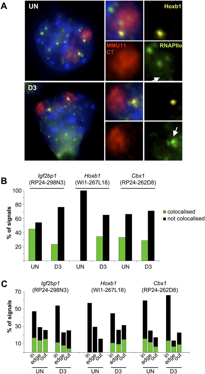 Locus colocalization with foci of RNAPII. (A) Immuno-FISH using an antibody against the phosphorylated form of RNAPII (green), Hoxb1 probe WI1-267L18 (yellow), and MMU11 chromosome paint (red) in undifferentiated ES cells (UN) or cells differentiated for 3 d (D3). The insets to the right show magnified images from one CT with arrows indicating the position of the Hoxb1 locus in the RNAPIIo channel. (B) Histogram showing the percent of signals either colocalized with (dark green) or distinct from (not colocalized; black) phosphorylated RNAPII foci for the regions encompassing Igf2bp1 (BAC RP24-298N3), Hoxb1 (fosmid WI1-267L18) or Cbx1 (BAC RP24-262D8) in undifferentiated (UN) or differentiated cells (D3). (C) Histogram of the nuclear distribution of signals in A with respect to their CT edge. n = 341 (Un), 89 (D3) for Igf2bp1; 62 (Un), 73 (D3) for Hoxb1; and 200 (Un), 90 (D3) for Cbx1.