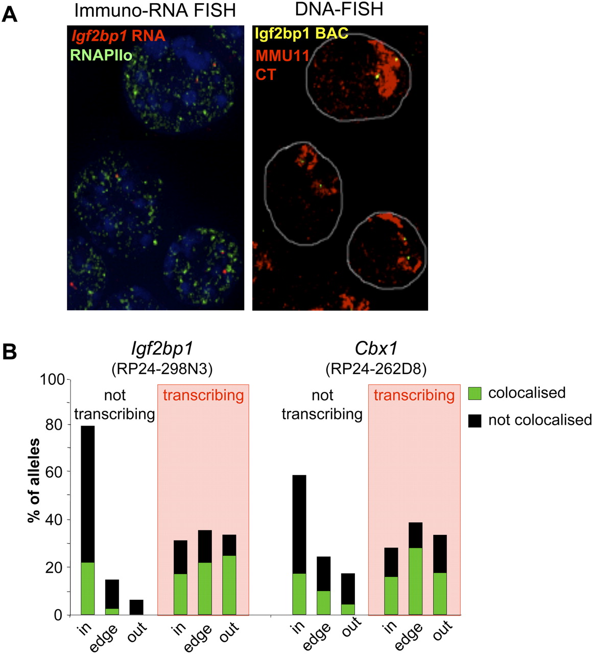 Active vs. inactive allele colocalization with foci of RNAPII. (A) Maximal projection image after deconvolution of 3D RNA-immuno-FISH using an Igf2bp1 intronic probe (red) and an antibody against the phosphorylated form of RNAPII (green) on DAPI counterstained nuclei of undifferentiated OS25 cells (left panel). The DAPI channel has been attenuated in order to improve the visualization of red and green signals. The right panel shows the same nuclei after denaturation and DNA-FISH with a BAC probe encompassing Igf2bp1 (RP24-298N3, yellow) together with an MMU11 chromosome paint (red). (B) Histogram showing the percent of nontranscribing and transcribing (shaded in red) Igf2bp1 or Cbx1 alleles located inside (in), at the edge (edge), or outside (out) of the MMU11 CT together with the percent of alleles colocalized with (green) or distinct from (not associated, black) a phosphorylated RNAPII focus within each category in undifferentiated OS25 cells. n = 288 (not transcribing), 206 (transcribing) for Igf2bp1 and 128 (not transcribing), and 57 (transcribing) for Cbx1.