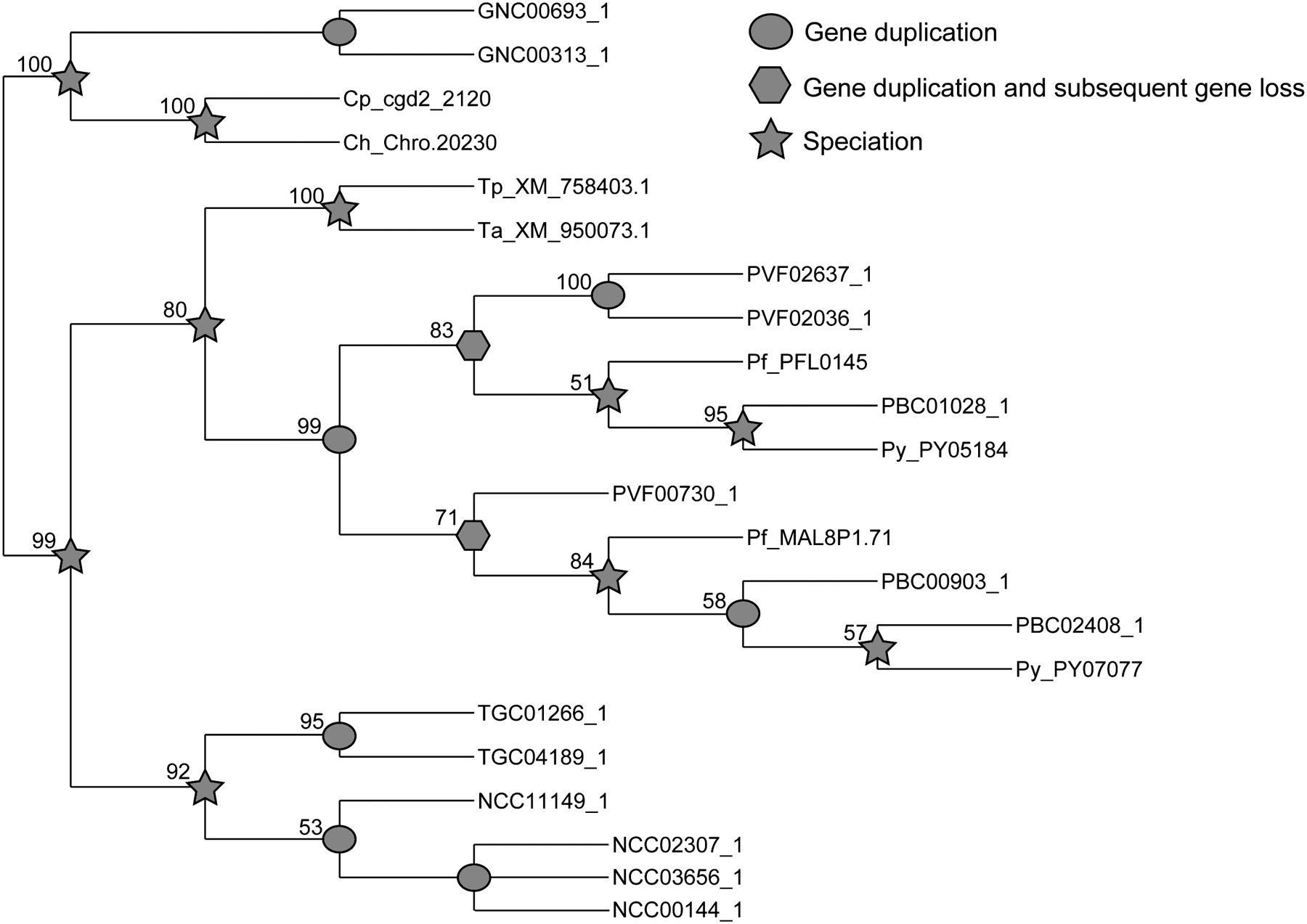 Proposed evolution of family 35_3.0. The multiple sequence alignment and phylogenetic reconstruction is described in the Methods section. There were two instances where gene duplication occurred, along with evidence for subsequent gene loss in one lineage. The incomplete nature of partial genomes makes interpretation of gene loss difficult, but has less effect when considering duplication events. Bootstrap values are given at the nodes and are a percentage of 1000 replicated multiple sequence alignments. Nodes supported by <50% of replicates are shown as a polytomy.
