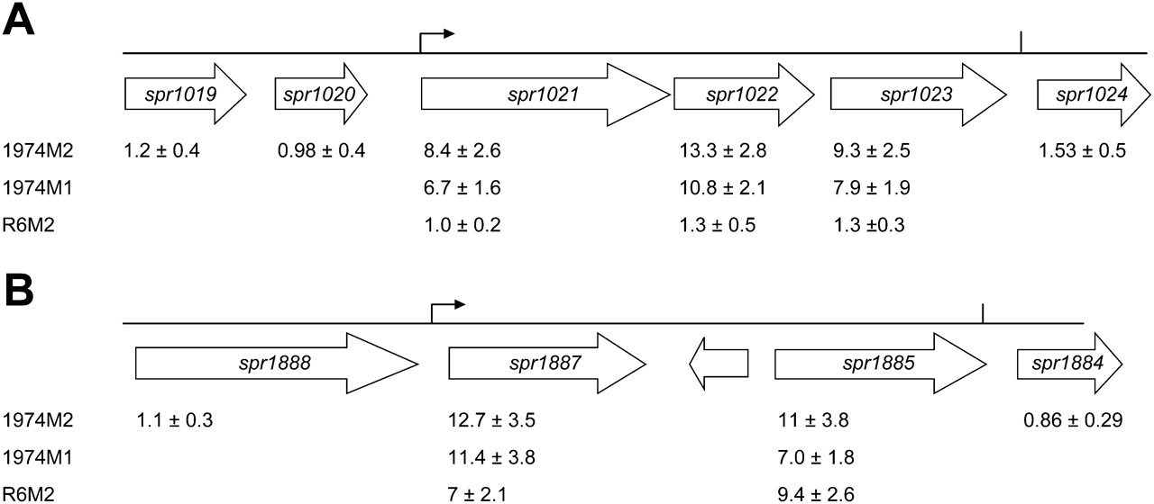 Monitoring mRNA expression by qRT-PCR in linezolid-resistant Streptococcus pneumoniae. Two genomic regions are shown, one containing the ABC protein gene spr1021 (A) and one containing the ABC protein genes spr1887 and spr1885 (B). Between spr1887 and spr1885 there is a putative ORF, although it is not clear whether it is real. The spr# is according to the nomenclature of strain R6. The RNAs were normalized with 16S rRNA. The expression ratios shown are the cycle threshold (Ct) ratios between the resistant cells and the parent wild-type cells for each individual gene shown. Possible sites of transcription initiation (arrows) and termination (vertical bars) of the operons are indicated. Values represent an average of three independent experiments.
