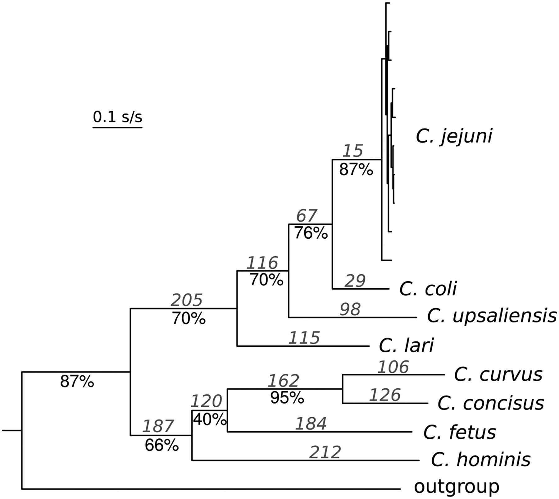 Campylobacter species tree. The maximum likelihood tree was obtained after concatenating the 511 congruent genes or gene fragments. On the branches of the tree are reported the percentage of gene tree support (black) as well as the number of genes found under positive selection (gray). (s/s) Substitution per site.
