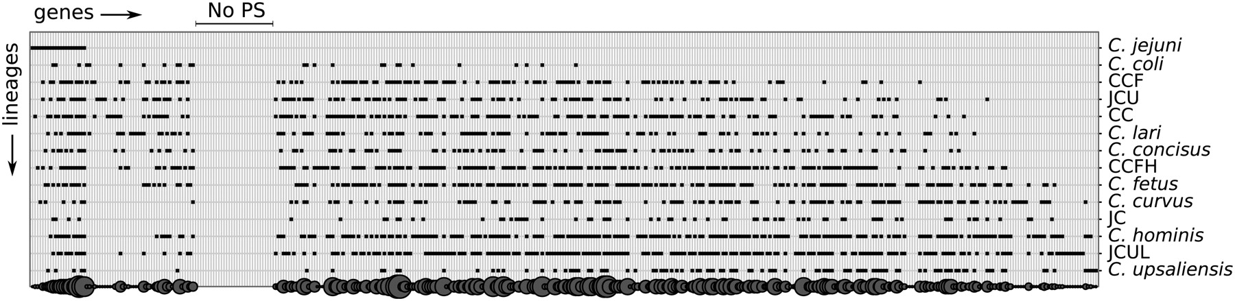 Distribution of the positively selected genes in the 14 tested lineages of Campylobacter. The genes and lineages were sorted following a correspondence analysis. (Black dots) Genes under positive selection, (gray circles of different diameters, bottom) number of lineages under positive selection (PS) for a specific gene. (CCF) C. consisus, C. curvus, and C. fetus ancestral lineage; (JCU) C. jejuni, C. coli, and C. upsaliensis ancestral lineage; (CC) C. consisus and C. curvus ancestral lineage; (CCFH) C. consisus, C. curvus, C. fetus, and C. hominis ancestral lineage; (JC) C. jejuni and C. coli ancestral lineage; (JCUL) C. jejuni, C. coli, C. upsaliensis, and C. lari ancestral lineage.
