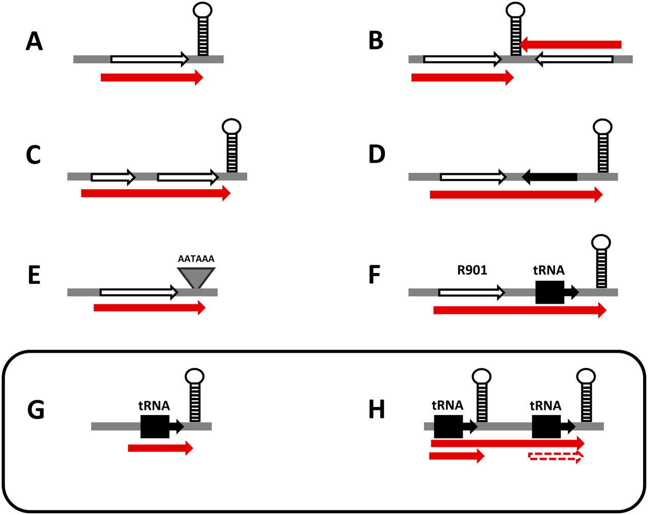 Experimentally validated Mimivirus polyadenylated transcript structures. Palindromic sequences are represented by hairpins; ORFs are indicated by open arrows; and transcripts by red arrows. (A) Single ORF followed by a palindromic polyadenylation signal; ∼70% of transcripts might fall in this category; 27 have been experimentally validated through a gene-by-gene analysis. (B) Convergent ORFs sharing the same palindromic polyadenylation signal; four such pairs have been validated (R257/ L258, R453/ L454, R497/L498, R528/L529). (C) “Polycistronic” transcripts, wherein polyadenylation occurs within the first palindromic signal encountered. Two such transcripts have been validated (L416-417, R882-883). (D) “Pseudo-polycistronic” messenger, wherein the 3′-UTR encompasses a neighboring ORF in the reverse orientation. Two such cases have been validated (L356-R355, L778-R777). (E) Infrequent cases of polyadenylation occurring within a low-scoring palindrome (e.g., L164) or following an AATAAA motif (e.g., R502, L532, polycistronic R463-465). (F) A unique case of a polyadenylated bi-cistronic transcript mixing the R901 ORF and a downstream neighboring tRNALeu. (G) Polyadenylated transcripts of individual tRNA genes (tRNATrp, tRNAHis). (H) Polyadenylated transcripts encompassing two adjacent tRNA genes (tRNAHis + tRNACys) coexisting with a single gene polyadenylated transcript (tRNAHis).
