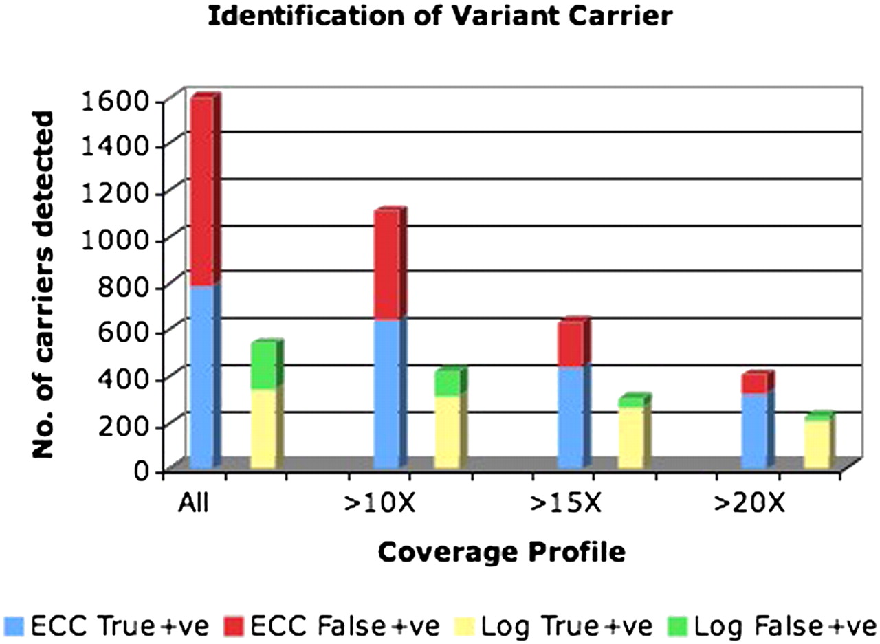 Identification of carriers. For log pools, 345 out of a total of 539 single carrier identifications were correct across all coverage profiles, 311 out of 421 were correct (≥15× coverage), 266 out of 302 were correct (≥15× coverage), and 206 out of 223 were correct (≥20× coverage). For ECC pools, 783 out of a total of 1597 single carrier identifications were correct across all coverage profiles, 637 out of 1109 were correct (≥10× coverage), 441 out of 633 were correct (≥15× coverage), and 321 out of 405 were correct (≥20× coverage).