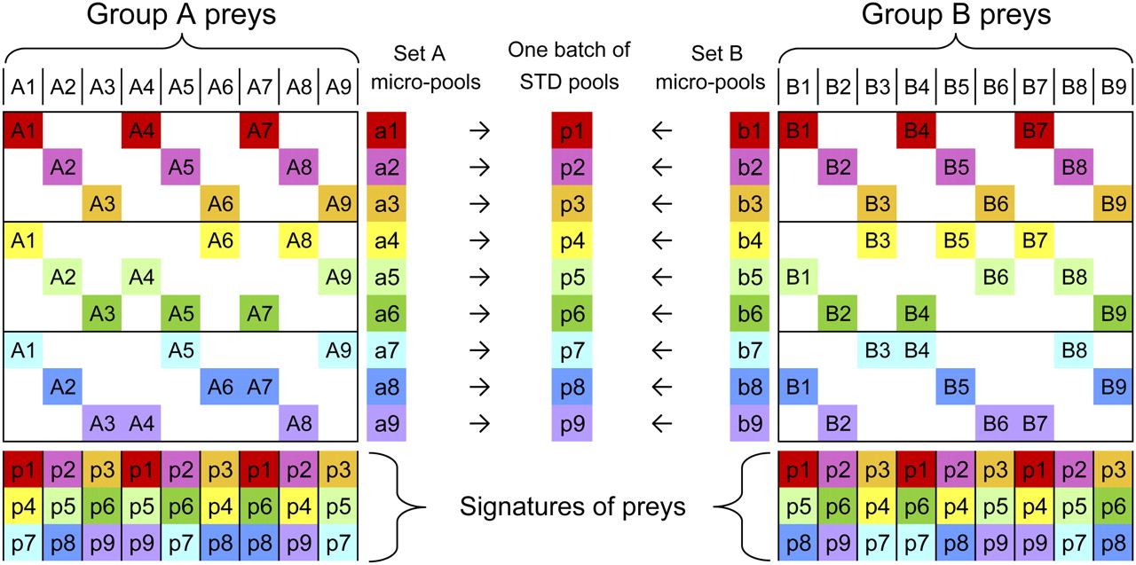 A simple STD pooling design. Two groups of nine preys (group A: A1–A9 and group B: B1–B9) are separately pooled into nine color-coded micropools (set A: a1–a9 and set B: b1–b9), according to subdesigns of a larger STD design (which can accommodate all 18 preys). Each micropool contains three preys (e.g., a1 contains A1, A4, and A7), and each prey is present in a unique combination of three micropools (a unique signature, e.g., a1|a5|a9 for prey A4). The pairs of same-numbered micropools from sets A and B can then be superposed to generate STD pools (one batch: p1–p9), each containing six preys, and each prey still has a unique signature in the STD pools.