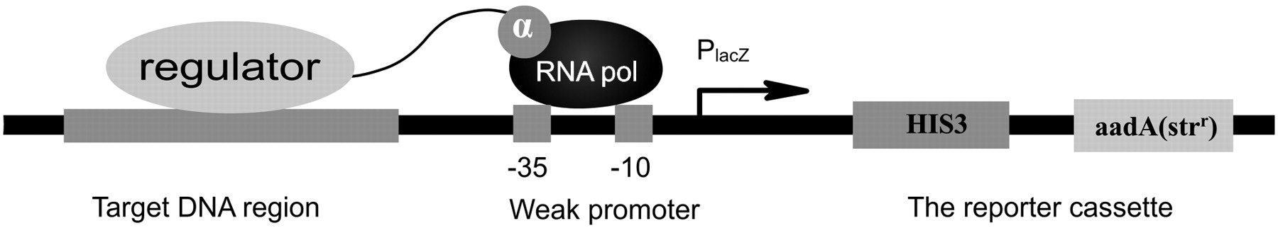 Schematic of the bacterial one-hybrid reporter system. In the new bacterial one-hybrid system, a selected promoter sequence or the other genomic DNA, the bait DNA, was cloned into the reporter vector of pBXcmT containing the selectable genes HIS3 and aadA. A given transcription factor or a library was expressed as a fusion to the alpha subunit of the RNA polymerase in the vector of pTRG. The reporter genes would be activated in case of interaction of the promoter region with a given regulator protein expressed in pTRG when a pair of recombinant vectors is cotransformed into the host strain. If the regulator protein interacts with the target DNA, it recruits and stabilizes the binding of RNA polymerase at the weak promoter and thus activates the transcription of the HIS3 reporter gene in the presence of the compound 3-amino-1,2,4-triazole (3-AT). A second reporter gene aadA encoding a protein that confers streptomycin resistance provides an additional mechanism to validate the DNA–protein interaction.