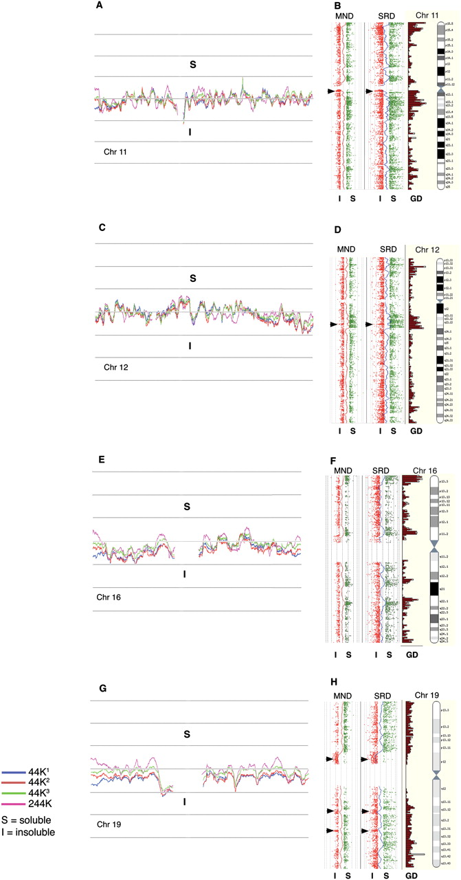 Whole chromosome CGH plots (human). (A,C,E,G) The log2R moving average profiles obtained from the 44K CGH analysis of SRDS/SRDI fraction pairs of three individual men (44K1, 44K2, and 44K3) for chromosomes 11, 12, 16, and 19. The moving average profile from an additional fraction pair analyzed on the 244K CGH platform is also shown. (B,D,F,H) The 244K probe plots from SRDS/SRDI and MNDS/MNDI data as individual log2R values >0.5; (green) soluble (S); (red) ≤0.5 insoluble (I) fractions aligned alongside Ensembl gene density profiles and chromosome ideograms (http://www.ensembl.org). Moving average traces that are dynamically equivalent to those drawn in panels A, C, E, and G are drawn between the fraction pairs. (Arrowheads) Olfactory receptor gene clusters on chromosomes 11 and 12 and zinc finger clusters on chromosome 19. With the exception of these cluster types, the tendency for the SRDS/MNDS probes to correspond closely with gene density profiles is clearly evident.