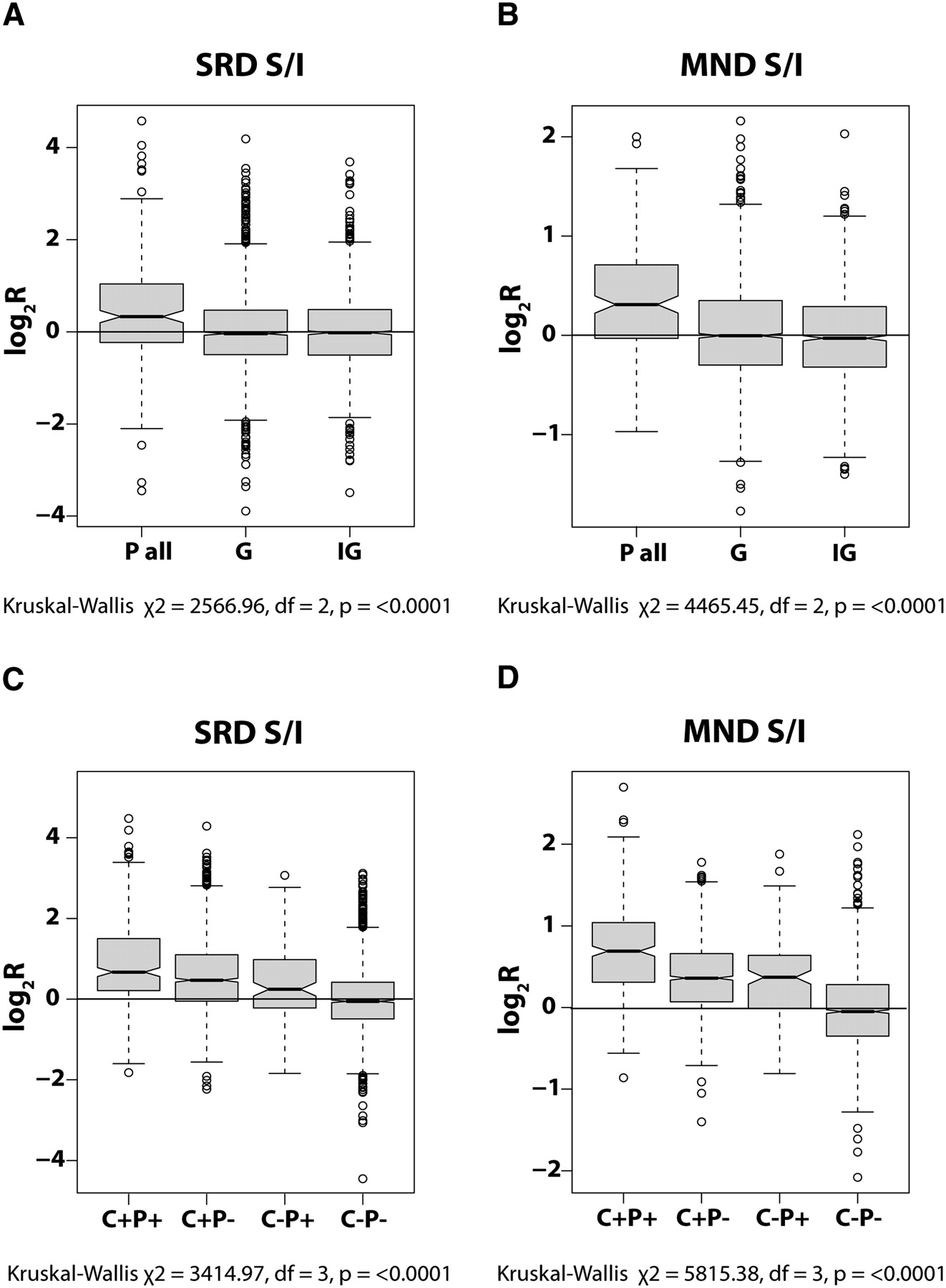 Gene regulatory sequences in MND and SRD fractions. Boxplots showing the partitioning behavior of sequences detected by all probes located within promoters (P all) in the SRD (A) and MND (B) fractions compared with those within genic (G) and intergenic (IG) sequences. The partitioning behavior of sequences detected by probes within CTCF clusters in association with (C+P+) or without (C+P−) promoters is shown for SRD (C) and MND (D) fractions compared with the behavior of promoters alone (C−P+; equivalent to “P all” in A and B) or the absence of both promoters and CTCF clusters (C−P−; equivalent to G/IG in A and B). The center of the boxes indicates the median value with the first and third quartiles drawn on either side. Notches indicate significant differences in median values (Tukey's honest significance difference). In all plots, log2R values >0 indicate solubility and <0 indicate insolubility. Note that the greatest skew toward solubility is for probes detecting sequences located within promoters and CTCF clusters, followed by probes with CTCF clusters alone, and then within promoters alone.
