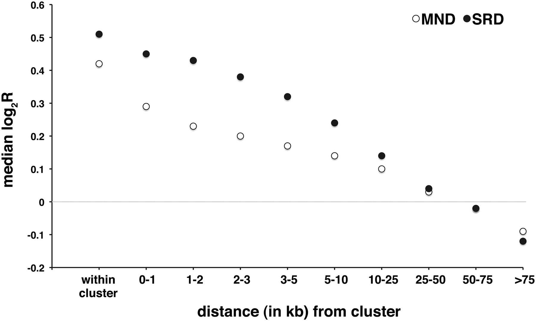 Regions flanking sites of CTCF binding are also enriched in soluble chromatin. The plot shows that the strong preference for CTCF clusters to partition into soluble SRD and MND fractions is shared by sequences flanking CTCF binding sites and extends for several kilobases. Note that median log2R values only return toward the median for the entire data sets after 50 kb and that sequences detected by probes lying in regions more than 75 kb from any sites of CTCF binding are actually enriched in insoluble chromatin (Kruskal-Wallis; χ2 = 534.5, df = 9, P < 0.0001).