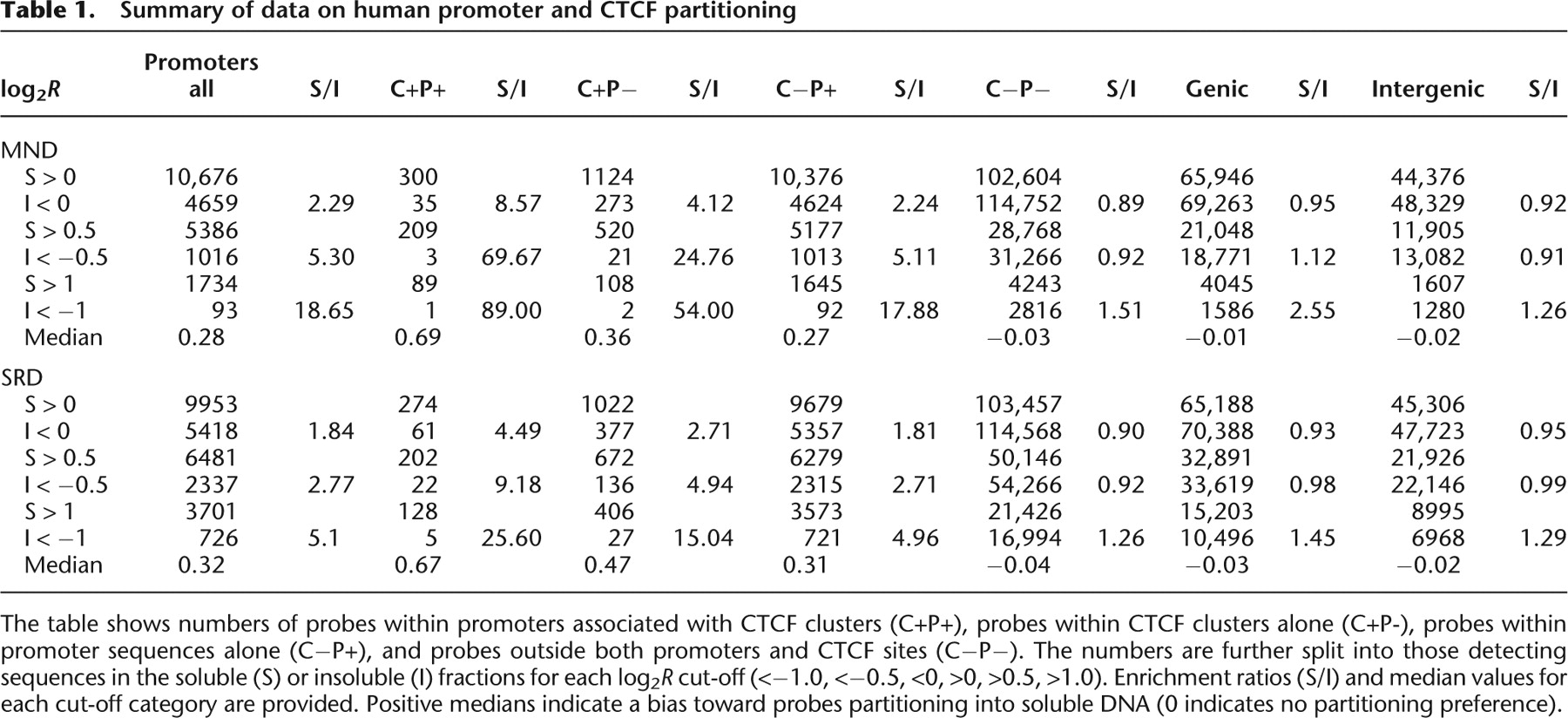 The table shows numbers of probes within promoters associated with CTCF clusters (C+P+), probes within CTCF clusters alone (C+P-), probes within promoter sequences alone (C−P+), and probes outside both promoters and CTCF sites (C−P−). The numbers are further split into those detecting sequences in the soluble (S) or insoluble (I) fractions for each log2R cut-off (<−1.0, <−0.5, <0, >0, >0.5, >1.0). Enrichment ratios (S/I) and median values for each cut-off category are provided. Positive medians indicate a bias toward probes partitioning into soluble DNA (0 indicates no partitioning preference).