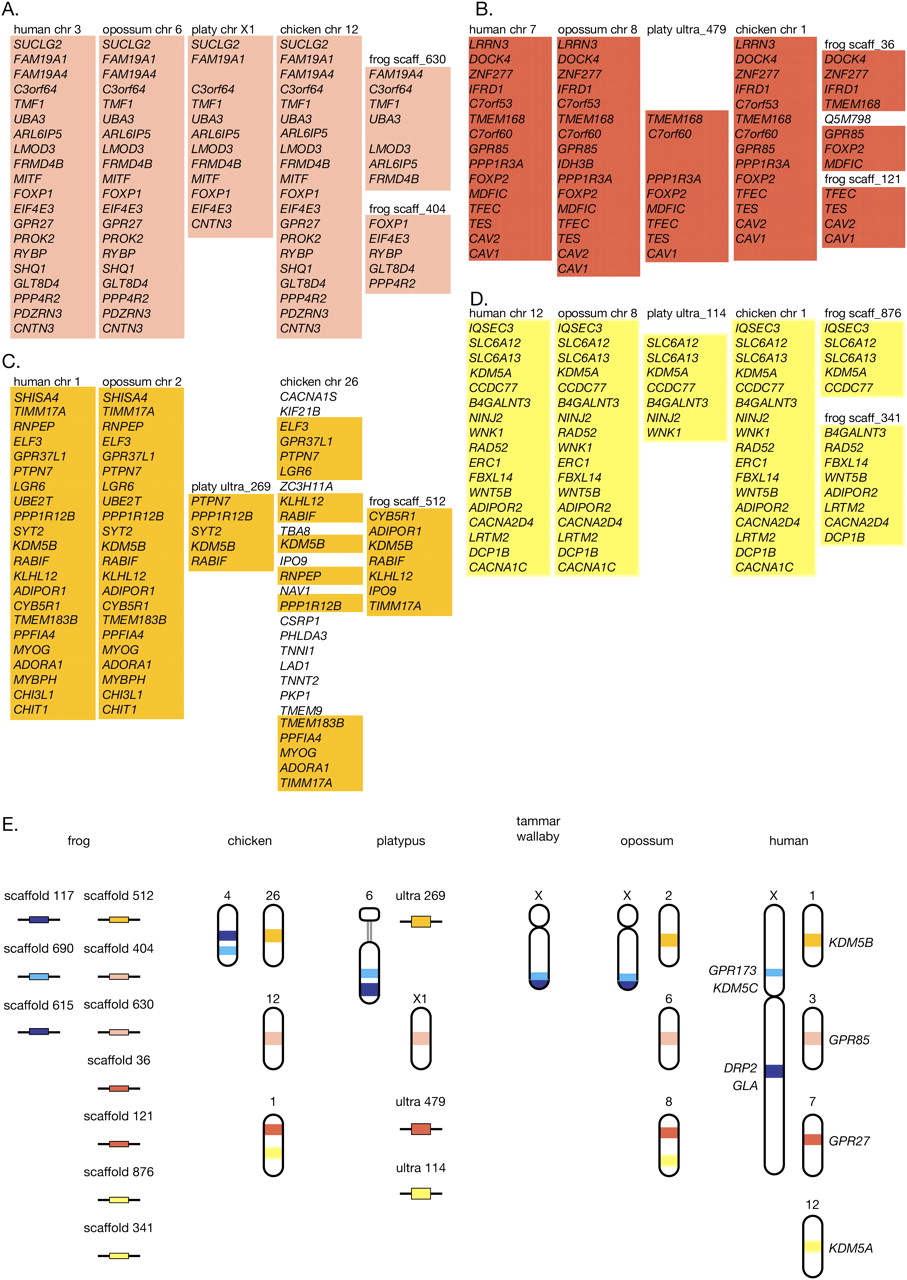 Conservation of the genomic context surrounding GPR173 and KDM5C indicates that their chicken homologs are paralogs and not orthologs. The gene arrangements surrounding the GPR173 and KDM5C paralogs are well conserved: (A) GPR27 (light red), (B) GPR85 (dark red), (C) KDM5B (orange), and (D) KDM5A (yellow). (E) Schematic representation of the gene arrangements of paralogous and orthologous regions to Xp11 stratum 2 genes across the vertebrates. Genes from the proposed Xp11 stratum 2a region (light blue) and the human Xq22 region (dark blue) containing GLA, DRP2, and WDR44 is indicated.