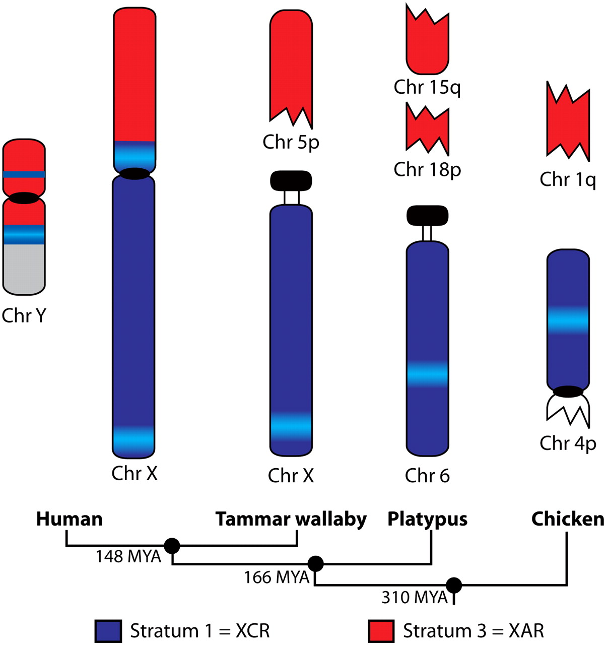 Summary of the current understandings of how and when the human sex chromosomes evolved. The XCR and XAR of the human sex chromosomes are shown and their corresponding regions of the tammar wallaby, platypus, and chicken. The proposed stratum 2 is now known to be a part of the XCR of the human X chromosome and does not have a separate evolutionary origin. Our localization of four Xp11 orthologs to chicken 4p suggests that stratum 2 genes are located on chicken chromosome 4p, although the majority of these genes were unable to be mapped. Divergence times given between each of the groups are millions of years ago.