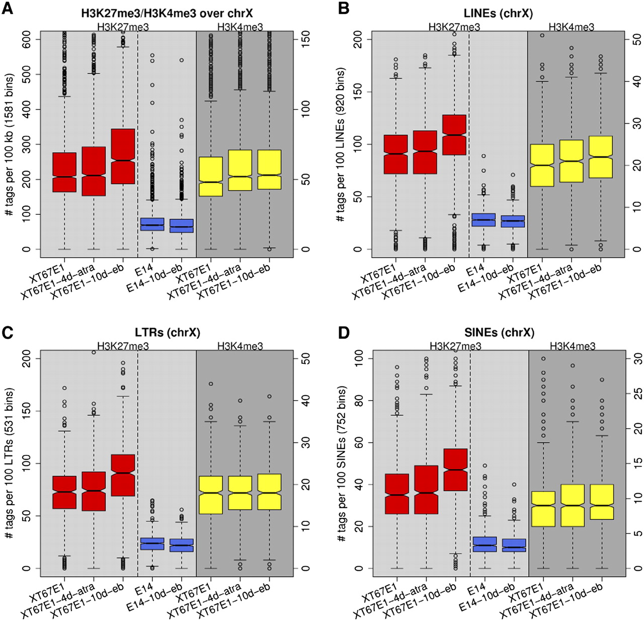 Boxplots of the occupancies of H3K27me3 and H3K4me3 over various repeats of chromosome X in female XT67E1 and male E14 cells. (A) All tags on chromosome X; a boxplot representation of the graphs shown in Fig. 5A. (B–D) Distributions over various repeat classes (LINE, LTR, and SINE repeats).