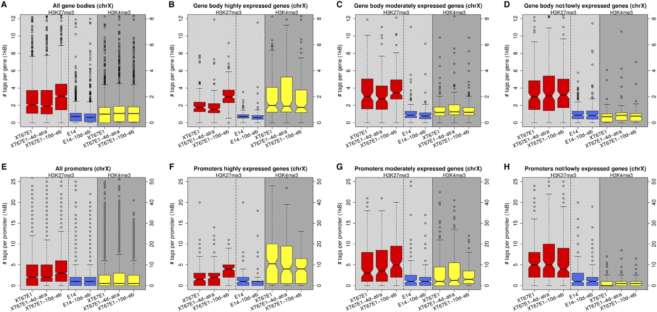 Boxplots of the occupancies of H3K27me3 and H3K4me3 over promoters and gene bodies of chromosome X. Genes were binned in three equally sized groups of 212 genes according to expression level, representing not/lowly-, moderately-, and highly-expressed genes, respectively. The red boxplots represent H3K27me3 occupancies for the female XT67E1 cells, while the yellow boxplots represent H3K4me3 occupancies. The blue boxplots represent H3K27me3 occupancies for the male E14 cells. (A–D) Distribution of H3K27me3 and H3K4me3 over gene bodies (from +500 to the end of Ensemble genes). (E–H) Distributions of H3K27me3 and H3K4me3 over gene promoters (from −700 to +300 of Ensemble genes).